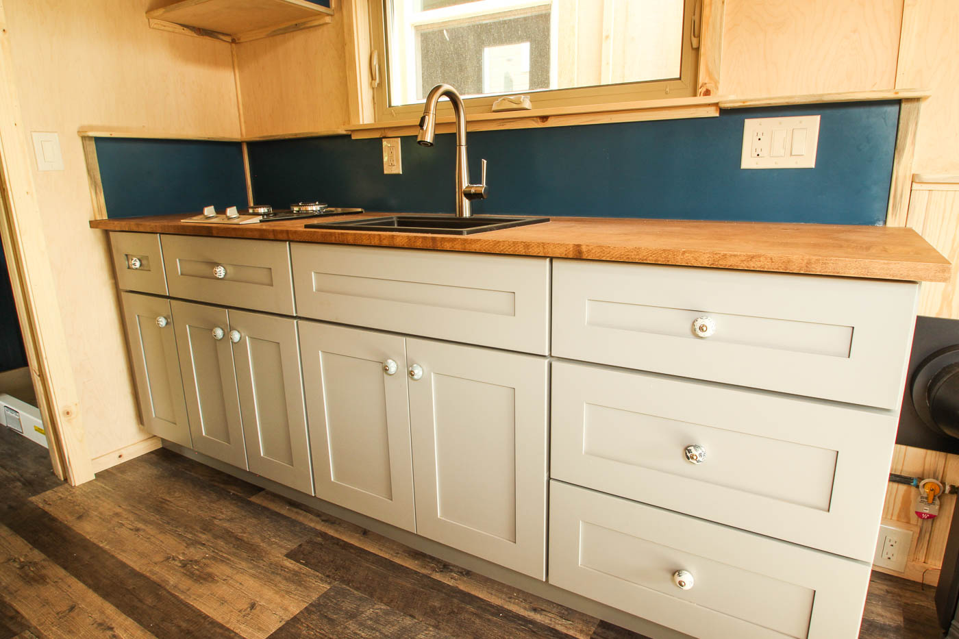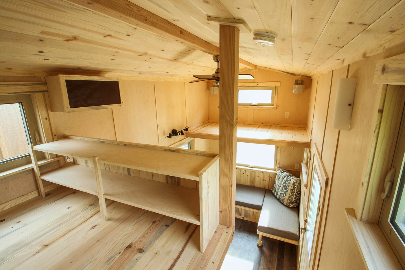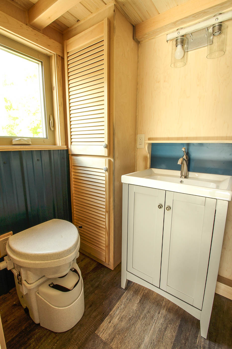 The bathroom is small and basic that has nature’s head composting toilet and a bathing section. You also get a Rinnai propane water heater and a standard washbasin with a vanity. The metal pro panel II roof of the house prevents water leakage and the entire house has a 10-year structural warranty.