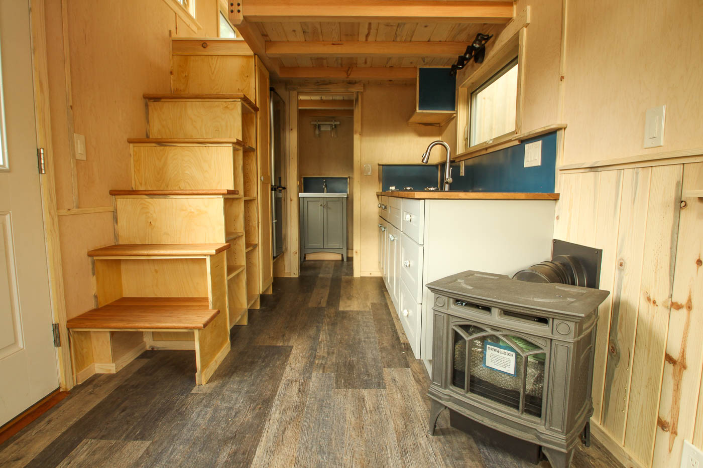 The living space has an in-built seating area underneath the storage loft where you can place cushion pads for comfort. You have a great opportunity to use your imagination and put your creativity to work by decorating the simple relaxing space to your heart’s desire. The compact free standing propane fireplace goes well with the interior design and keeps the tiny house warm and cosy. There are two lofts where one can be used for storage and the other is the bedroom.