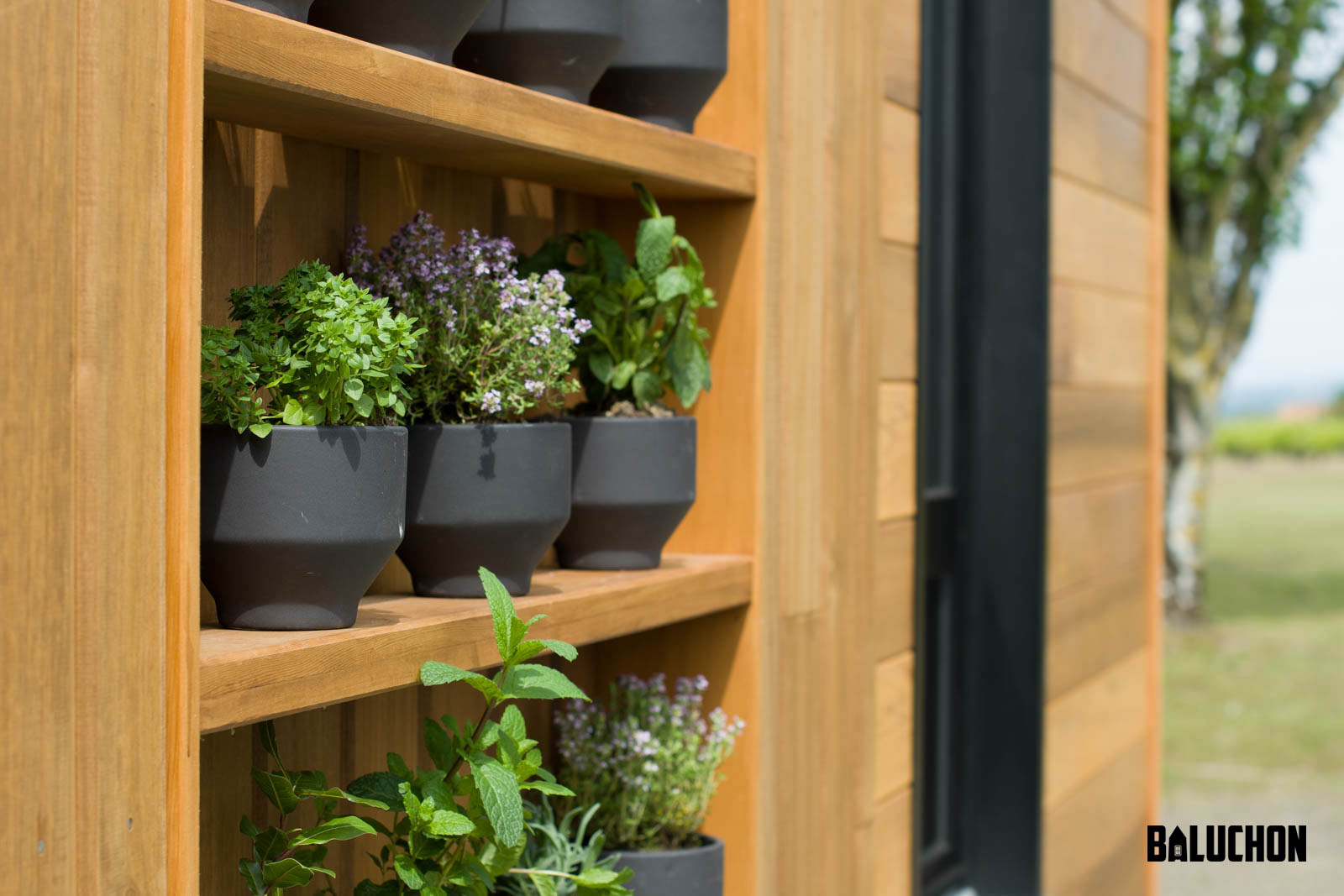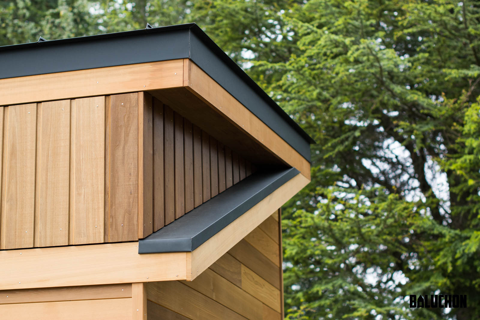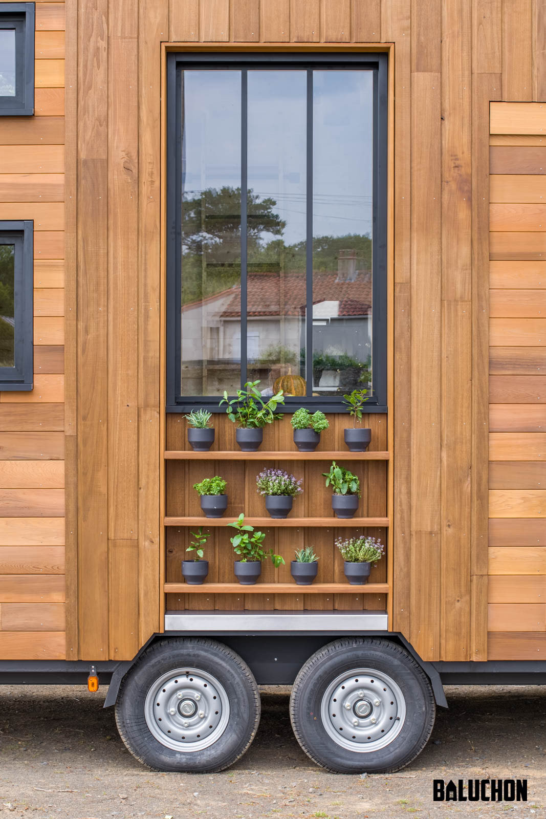 There are horizontally installed wooden panels in the exterior for lap siding while a small portion of the front wall displays long vertical wooden panels that add a unique touch to the Astrild’s appearance. A neat arrangement of glass windows of different shapes and sizes is provided not just for utility but also for style. The chic broad glass window next to the main entrance door has three shelf planks underneath it. These planks hold multiple tiny plants in black pots that match the colour of the roof to keep up with the colour scheme while also adding elegance to the Astrild.