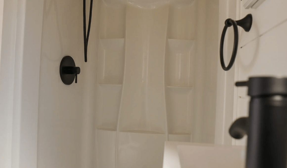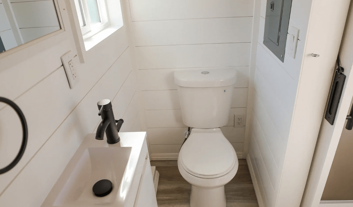 The kitchen in the Bay Cottage is designed for efficiency and functionality. The humidity sensor helps maintain optimal conditions, while the Ikea countertop of your choice offers versatility and style. A 10-gallon electric water heater ensures a steady hot water supply, and the kitchen sink with a spring swivel faucet simplifies dishwashing. The 10.1 cu. ft. refrigerator and 2-burner electric induction cooktop offer modern conveniences. Safety measures include a fire extinguisher and smoke/carbon monoxide alarm. Kitchen cabinets from Hampton Bay provide ample storage, and the range hood fan keeps the air fresh. The 7.5-inch LED colour-changing flat panel lights add a touch of ambiance.