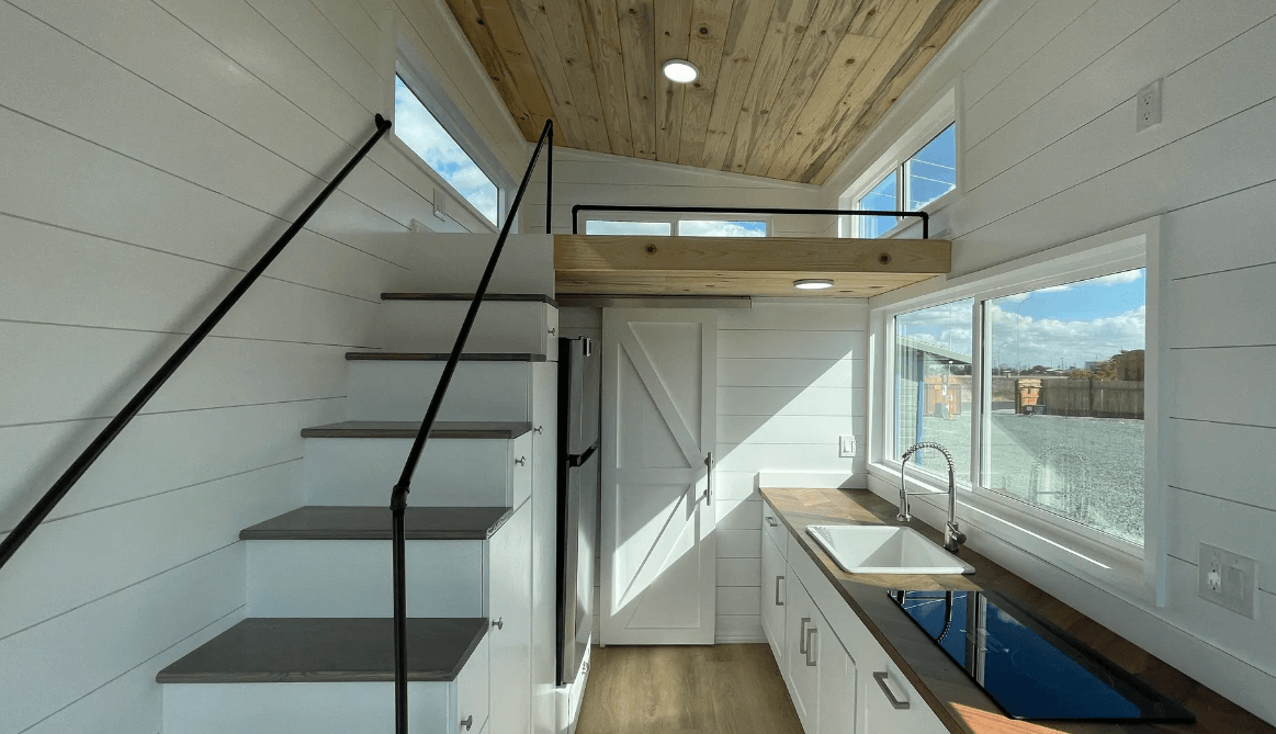 The Bay Cottage effortlessly captures our imagination. Its allure lies in the panoramic windows that invite the coastal landscape to become an integral part of our daily life. The thoughtfully crafted structure, built on a custom trailer, assures us of its durability and adaptability to different locations. With its cozy living room, well-appointed kitchen, and comfortable bedroom loft, we can already picture ourselves basking in the tranquility and warmth of this charming abode. The Bay Cottage promises a perfect balance of relaxation and modern convenience, making it the ideal coastal haven for creating lasting memories and embracing a simpler, more fulfilling lifestyle.