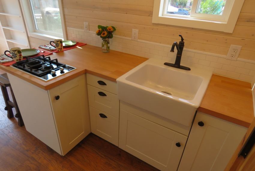 The living room comes with an L-shaped in-built seating platform that provides comfort to the residents who can make use of it for their own personal use as well as for seating any visitors. You additionally get an Entertainment Center with enough space to hold a 32 inch television screen. The adjacent kitchen holds a butcher block countertop which has a deep farmhouse sink embedded in it and also has a 2 burner cook top. The bar area is versatile as it can be used for preparing the food and can also double up as a small dining table for 2.