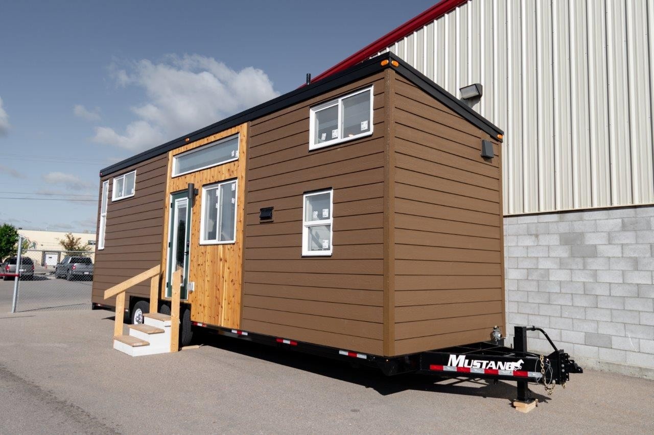 Exterior is refined with horizontal cedar Tongue and Groove siding, and a vertical seam metal siding establishes the quality of this tiny house. Shed style roof allows for maximum height in each loft, and is bright and airy with all the windows.