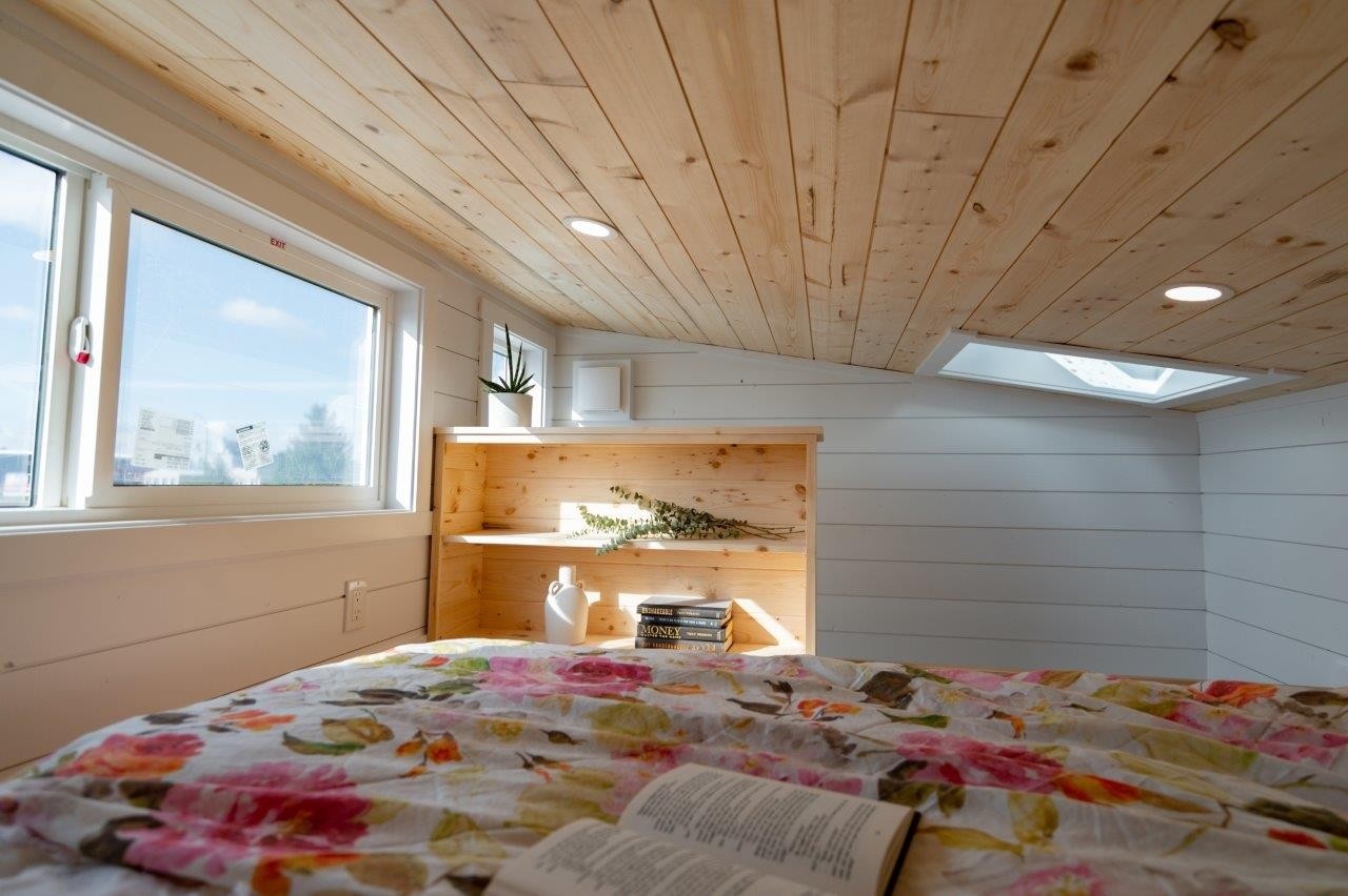 Uniquely placing the stairs in the back of the tiny home allows the rest of the tiny home to be completely open. The stairs with a bright full size window up to the main loft create a comfortable main sleeping area for anyone looking to go tiny, while still maintaining most of the living space on the main floor. Built in shelves and storage in the loft create the perfect space for organizing all your belongs and keep your tiny from becoming cluttered.