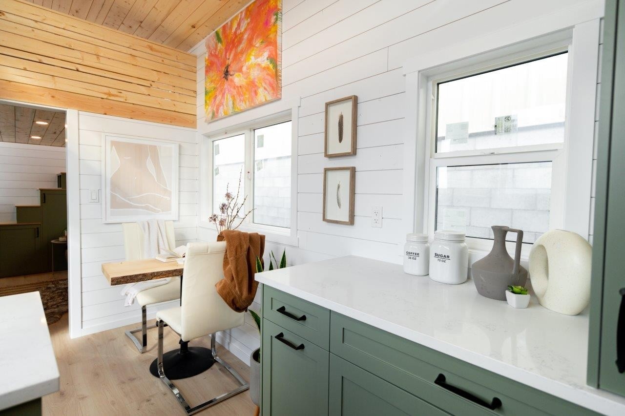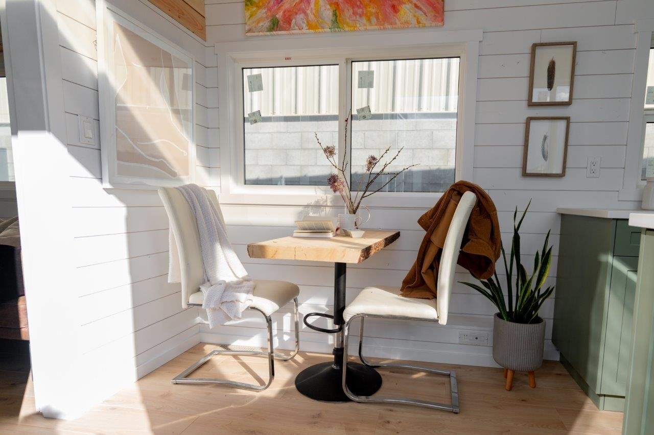 The clean lines of the walls and feature walls with the natural wood creates the perfect tiny home for almost any use case!