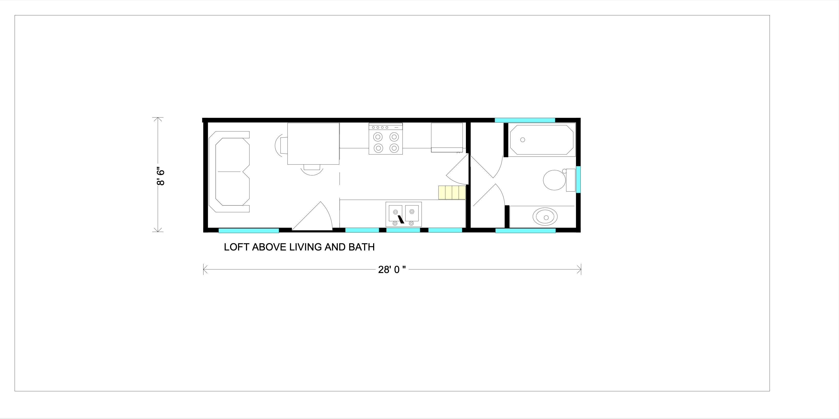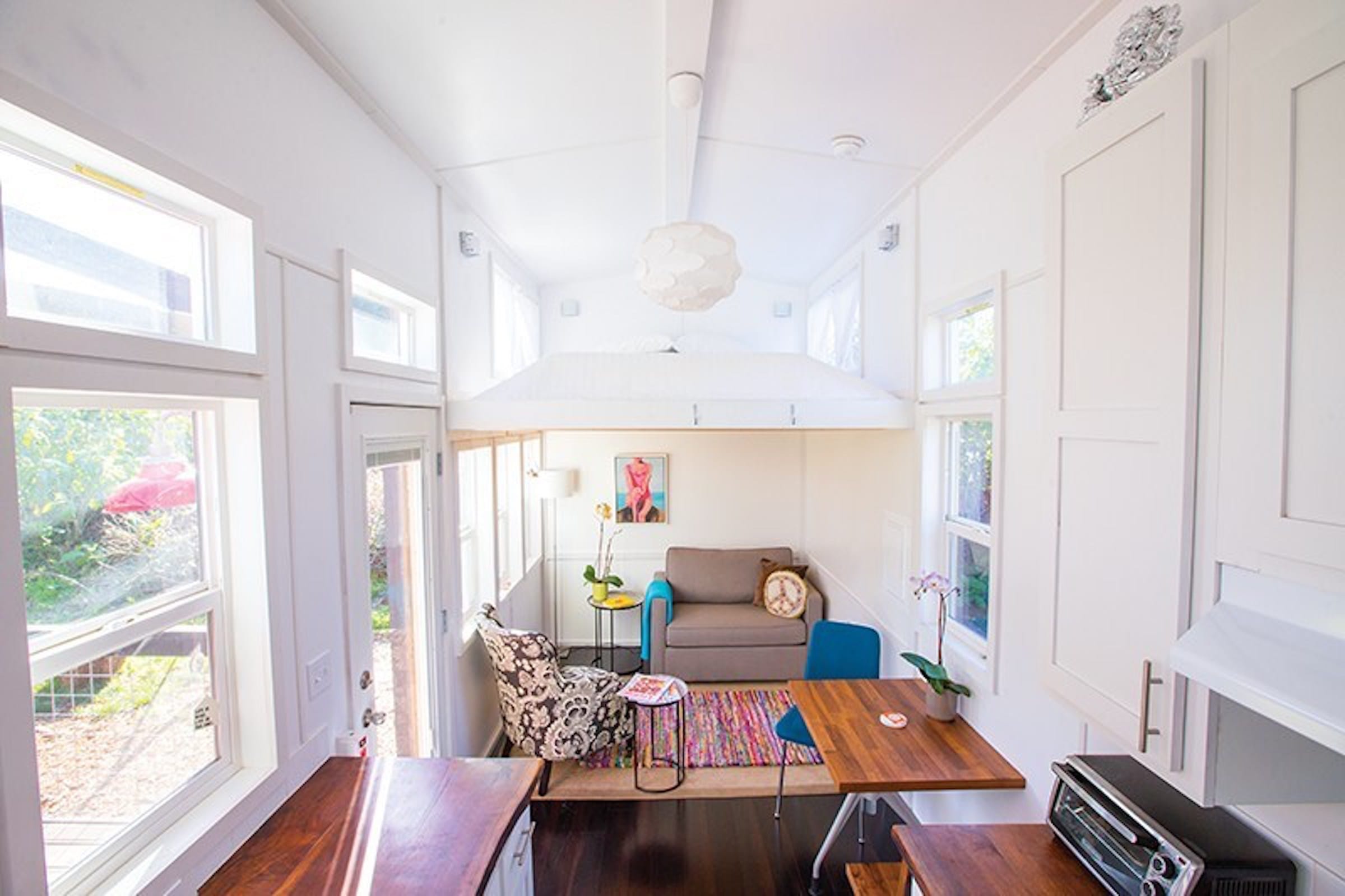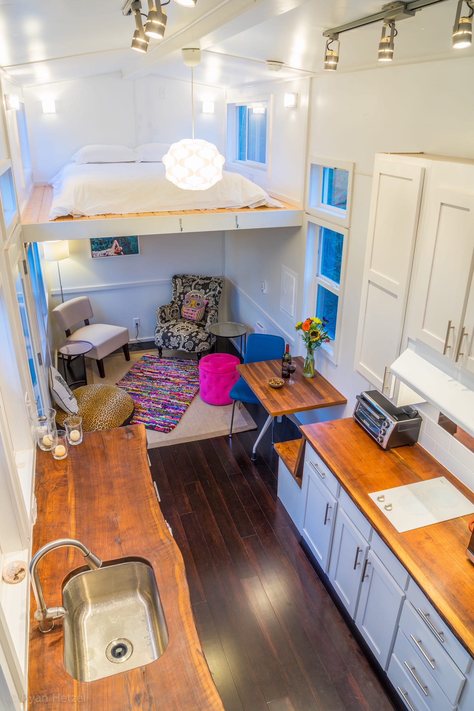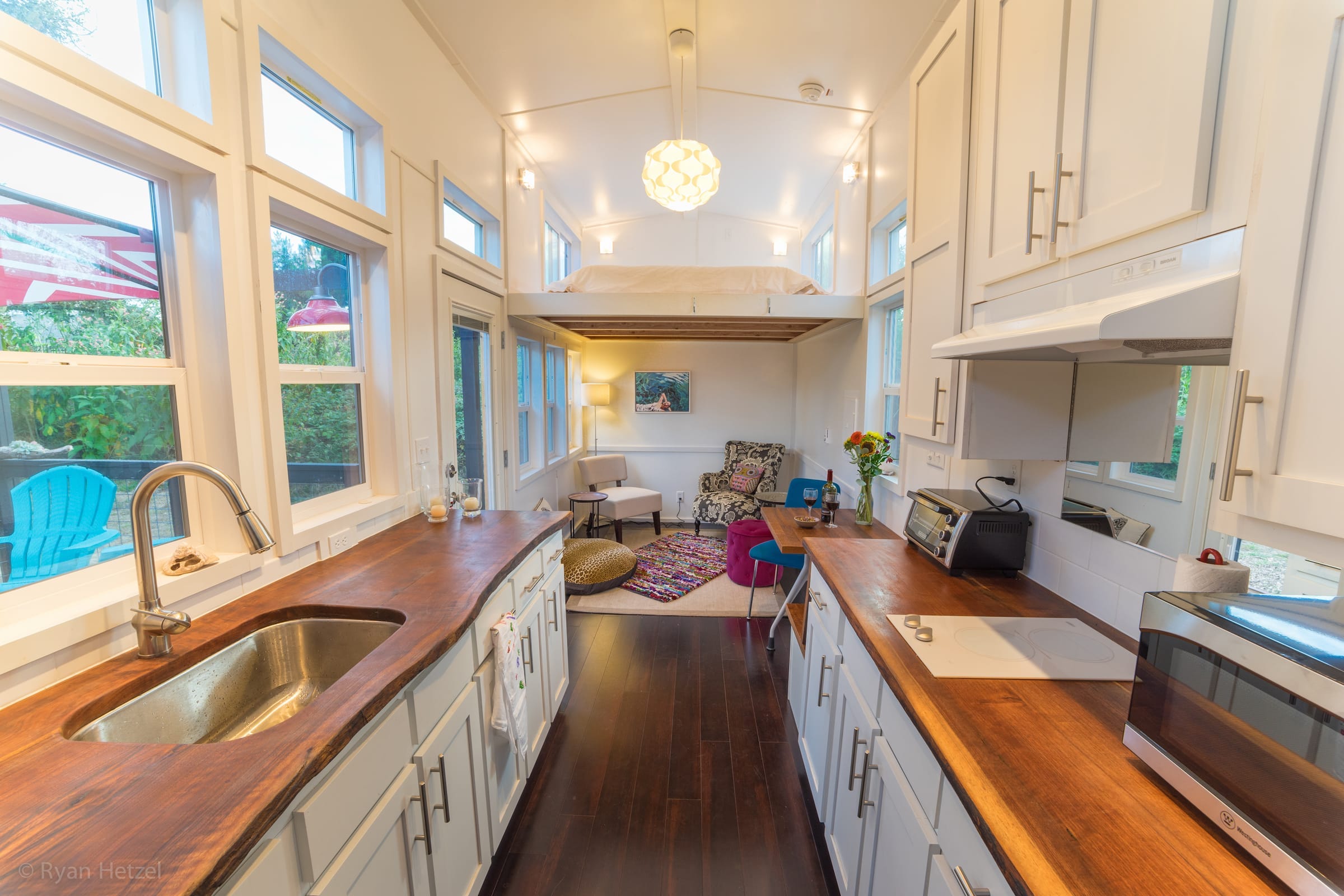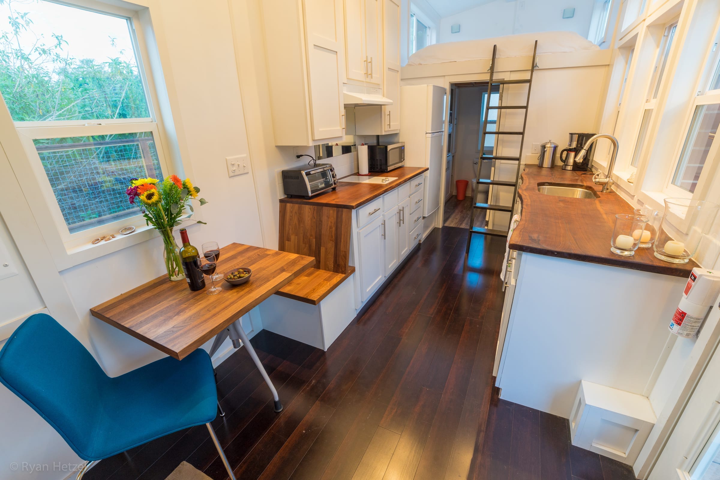 The open kitchen has two parallel counters affixed on both the walls facing each other. Both the counters have a wooden top that looks chic. A stainless steel sink and an array of cabinets makes the kitchen more practical. The entire kitchen offers storage facility in many faces. You can use a hide away ladder to go up to the sleeping loft which is big enough to sleep up to two people. The bathroom holds all the basic amenities.