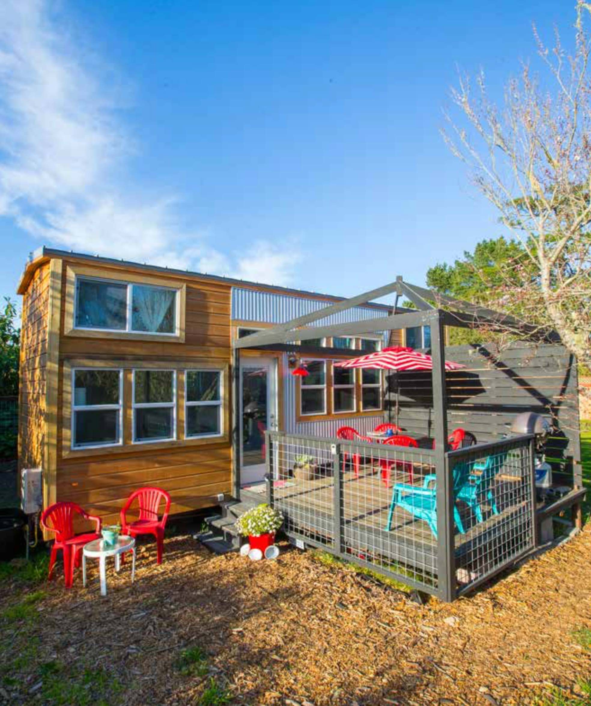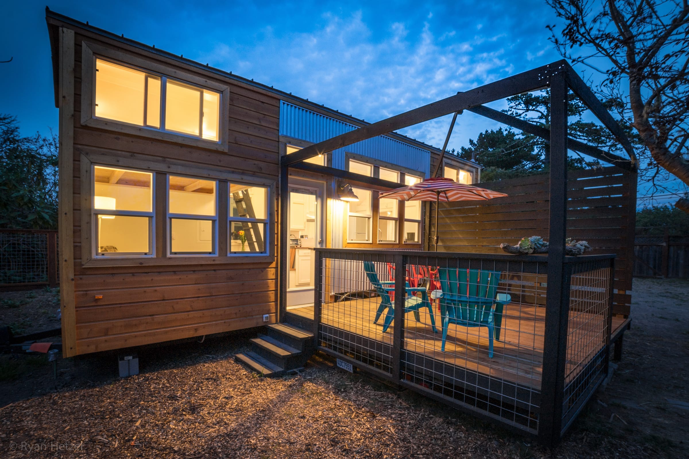 The main house is a long trailer with wooden brown lap siding that looks bright and beautiful. The broad glass windows have white frames which add a pop of colour and shine vividly against the brown backdrop. The windows are an amazing addition to this house that should be counted as an example of architectural intelligence as these windows do not only serve the purpose of keeping the indoors illuminated with natural light but also look extremely classy and make the Bolinas get its exquisite look. The glass door follows suit to follow the dazzling theme.