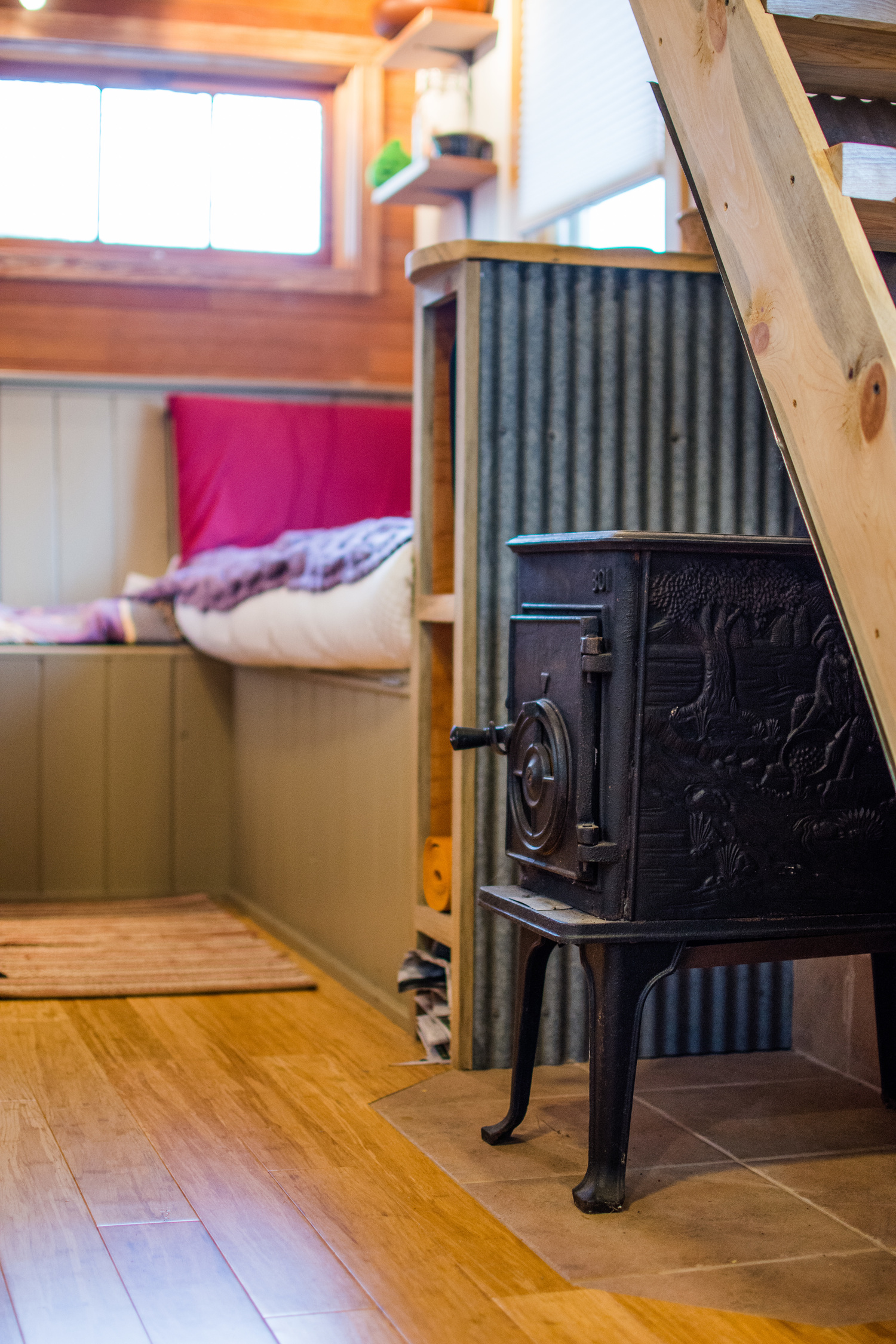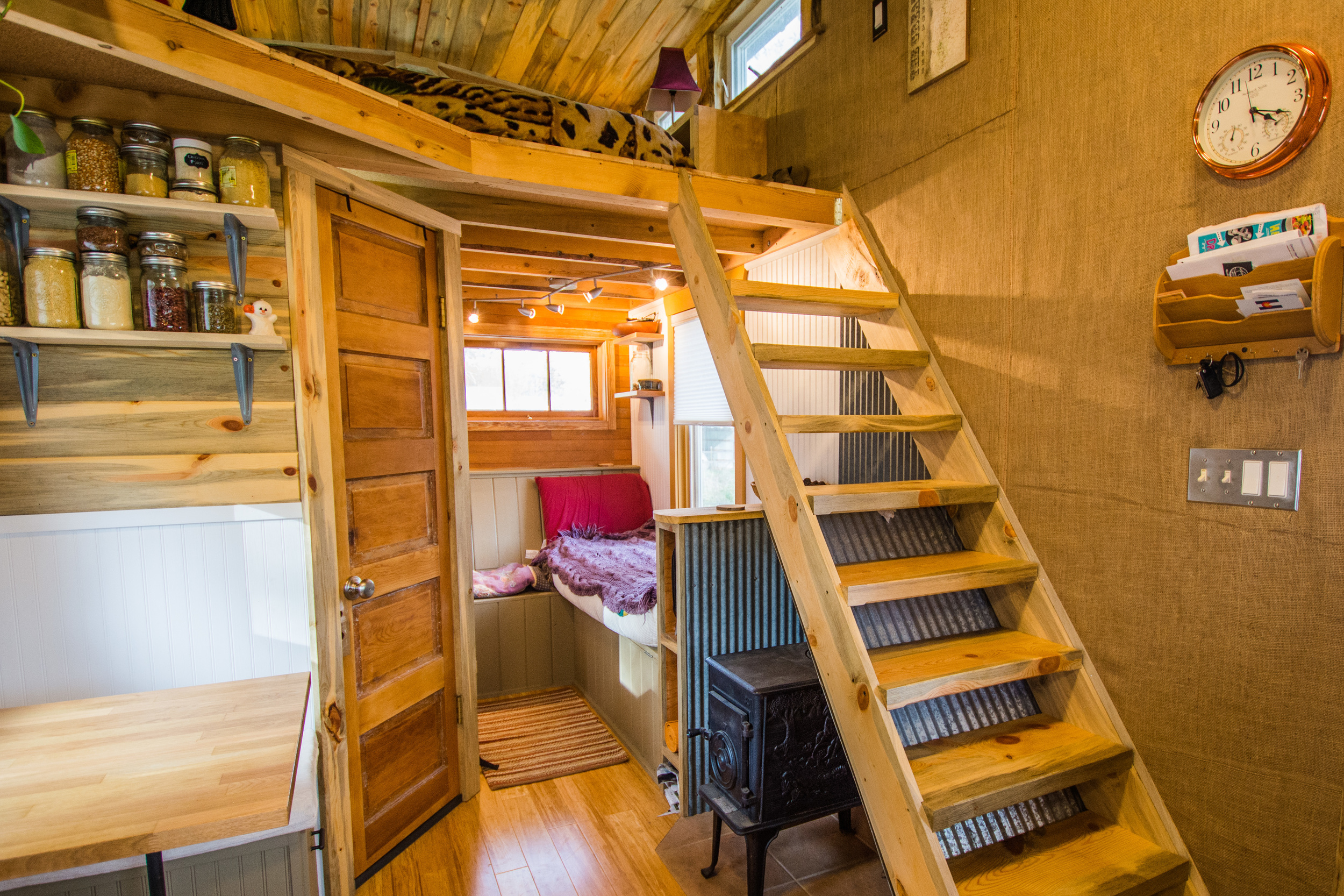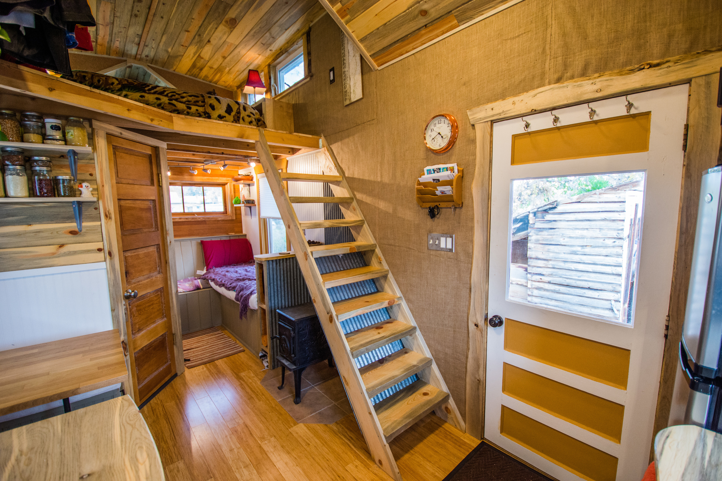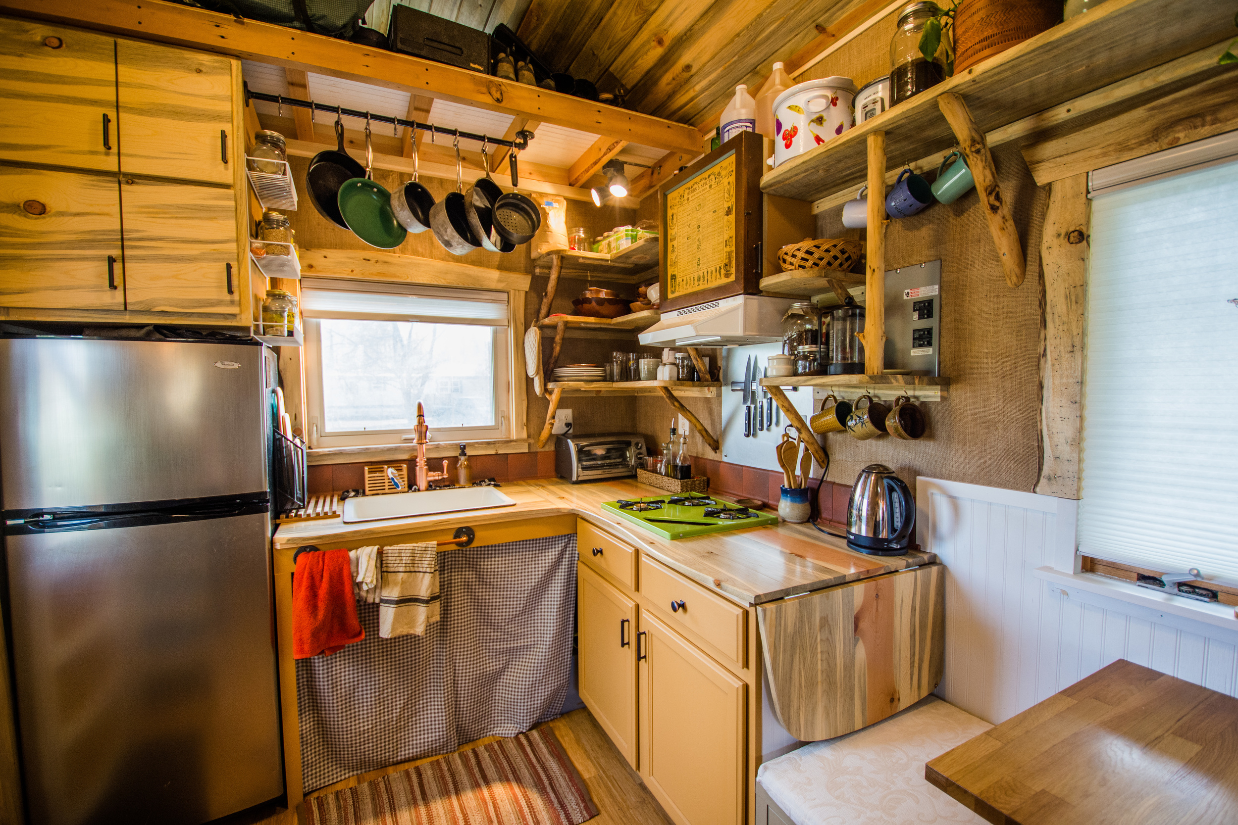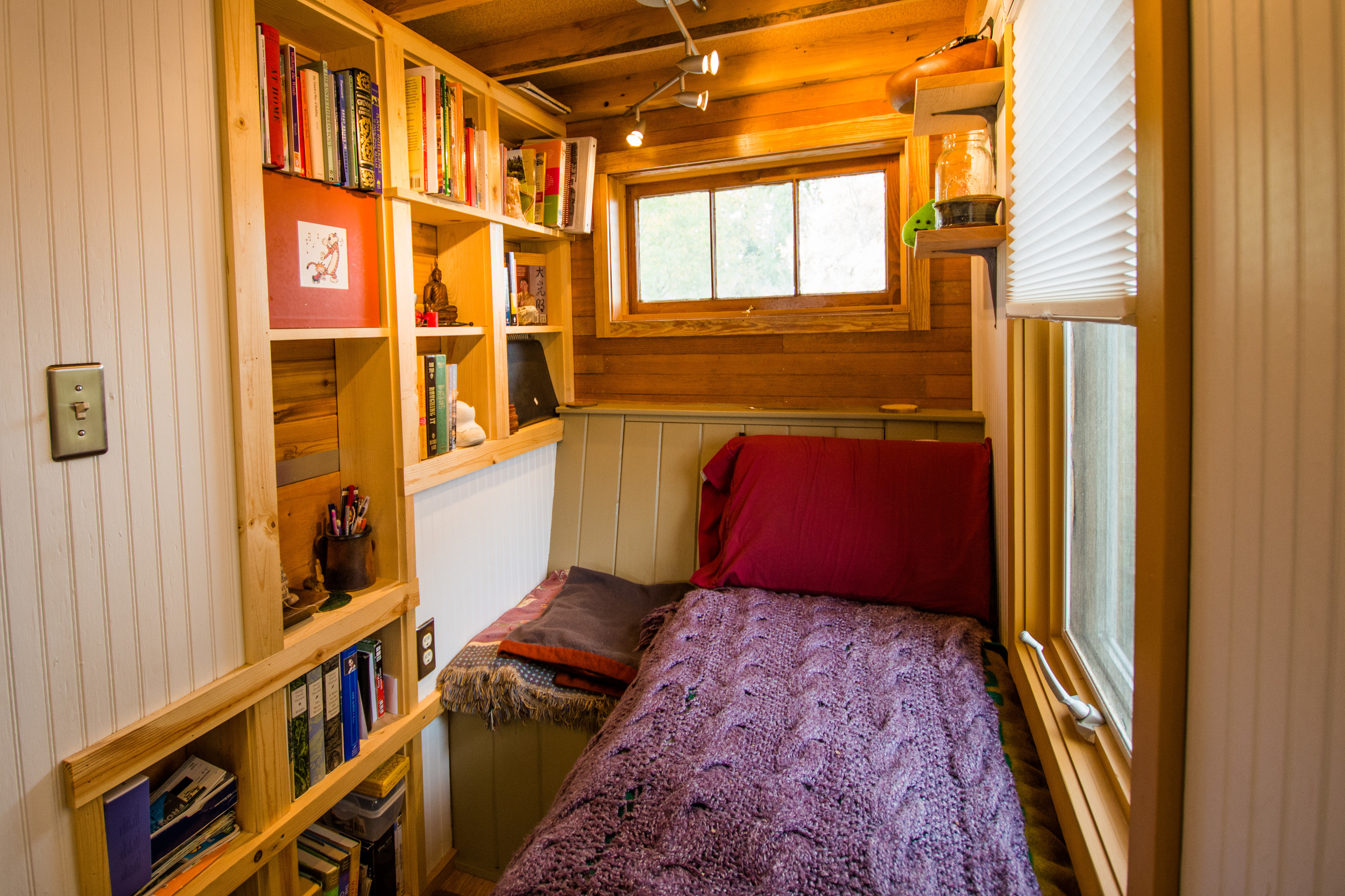 As you enter your Bookworm tiny house with the main door on the right you see a wooden ladder, on the left, you see your kitchen. On the right, you see your living space that is compact but modern. An L-shaped sitting bench is there nearby the window and in front of that, there are bookshelves for storing your favorite books & novels. Blinders are there on the window to stop excessive sunlight during the summer days. The best part about this tiny living space is that one can use this area as bedding for their guest. A little fireplace is also there nearby the L-shaped bench.
