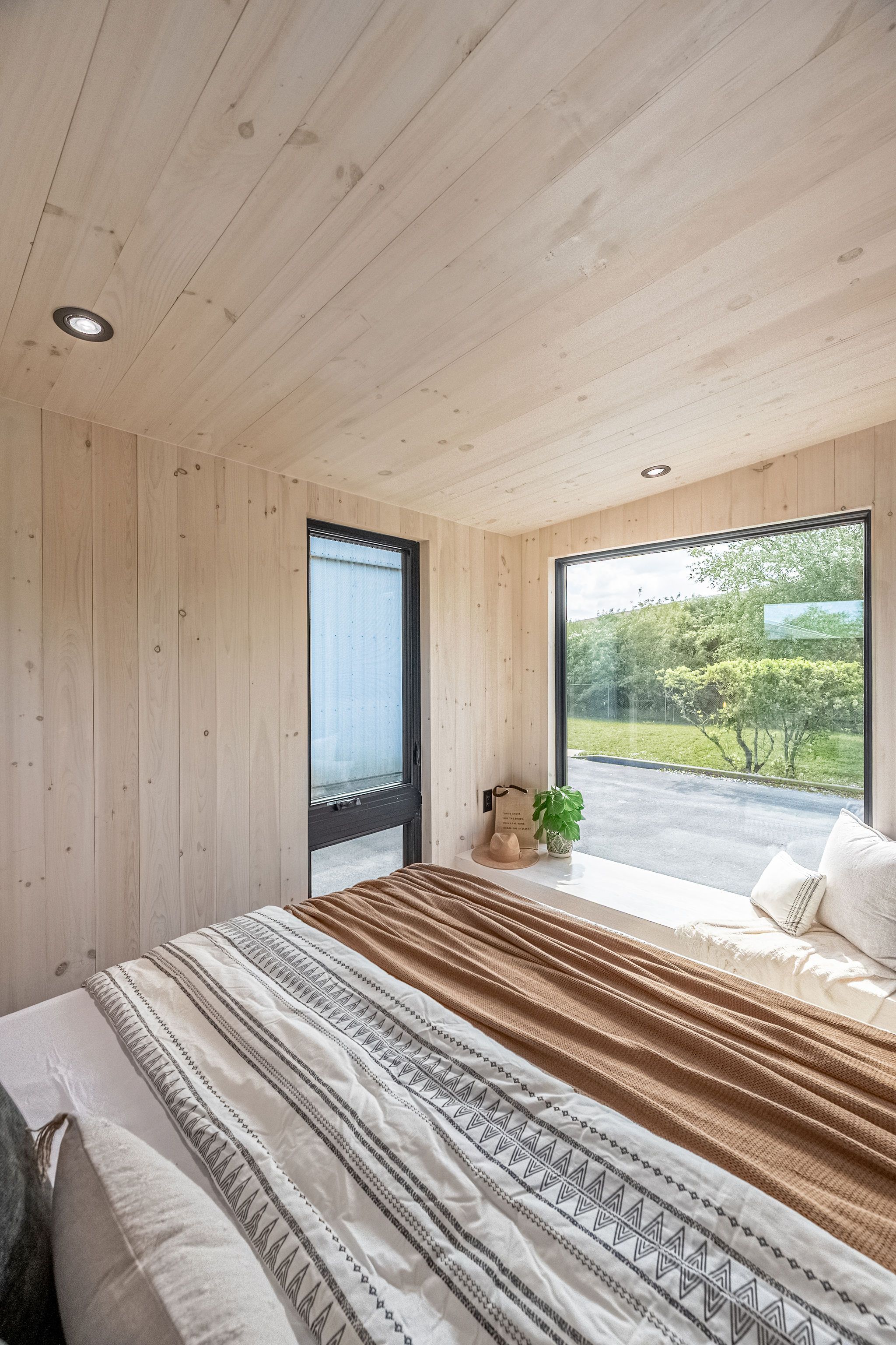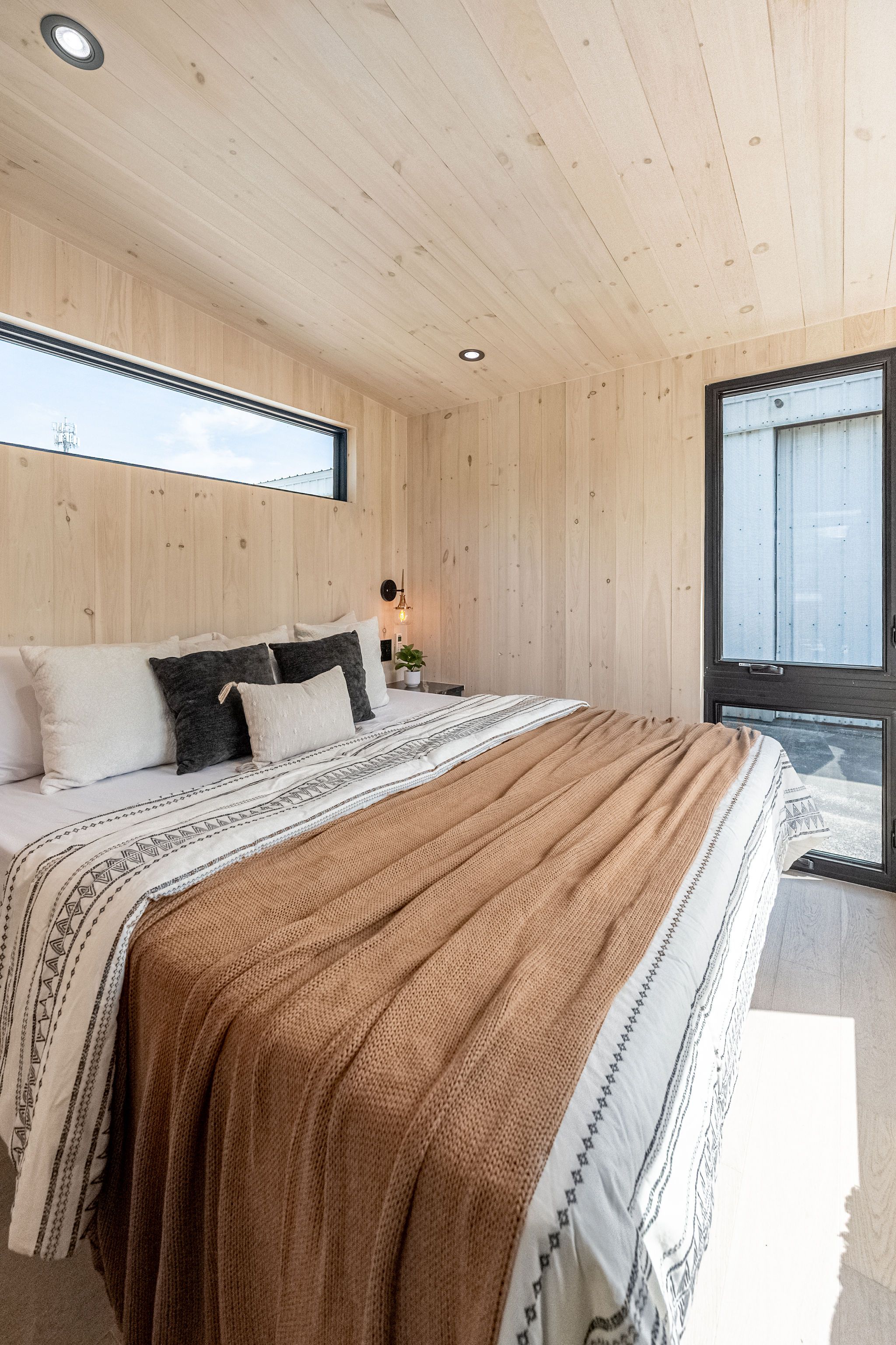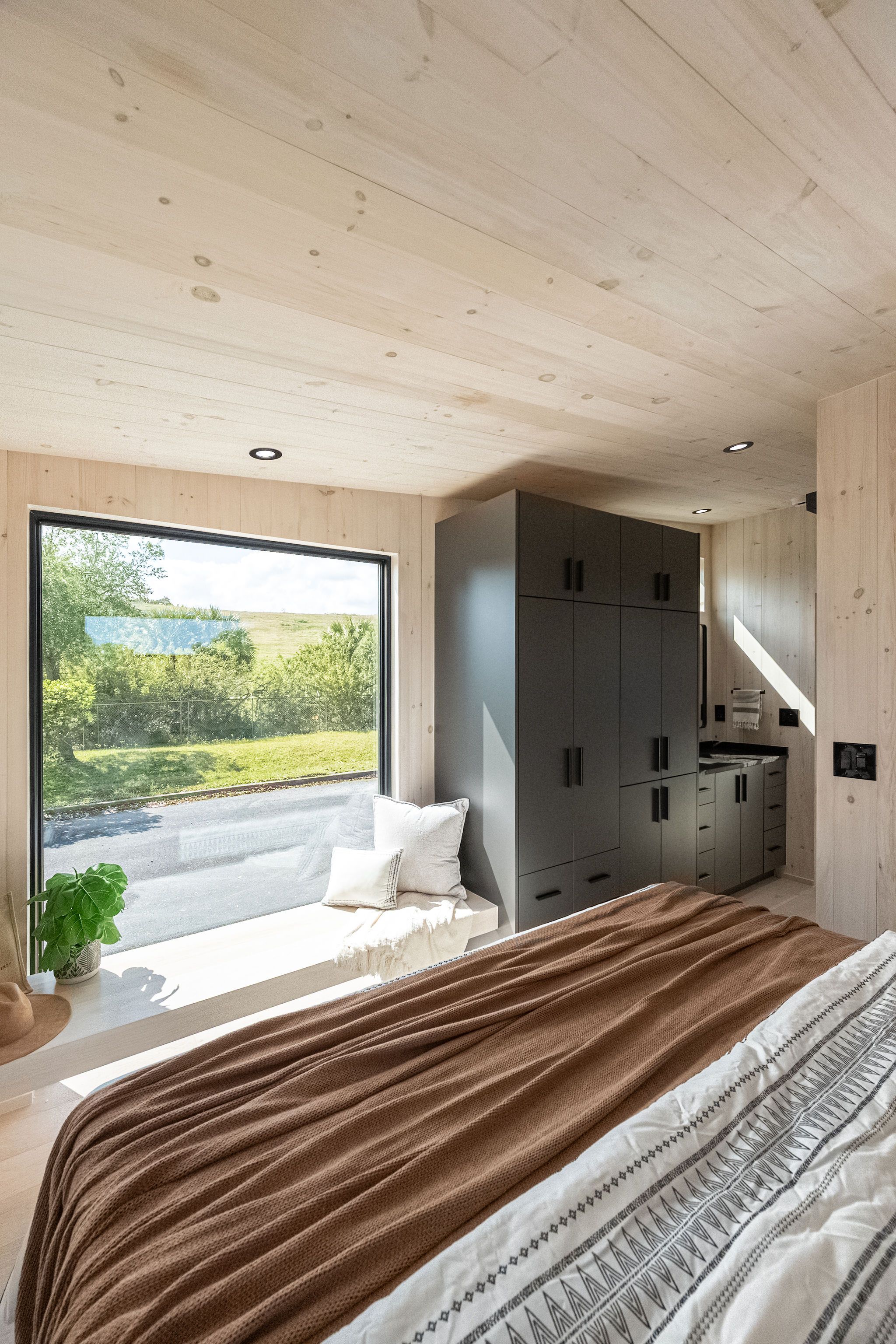 The Bozeman stands out with its single-level layout—no lofts or ladders here. The bedroom is surprisingly spacious for a tiny home and easily fits a king-size bed. There’s also built-in storage and enough floor space for a chair, bench, or even a small desk. This room is designed to be both comfortable and practical, whether you're living in the home full-time or using it as a guest retreat.