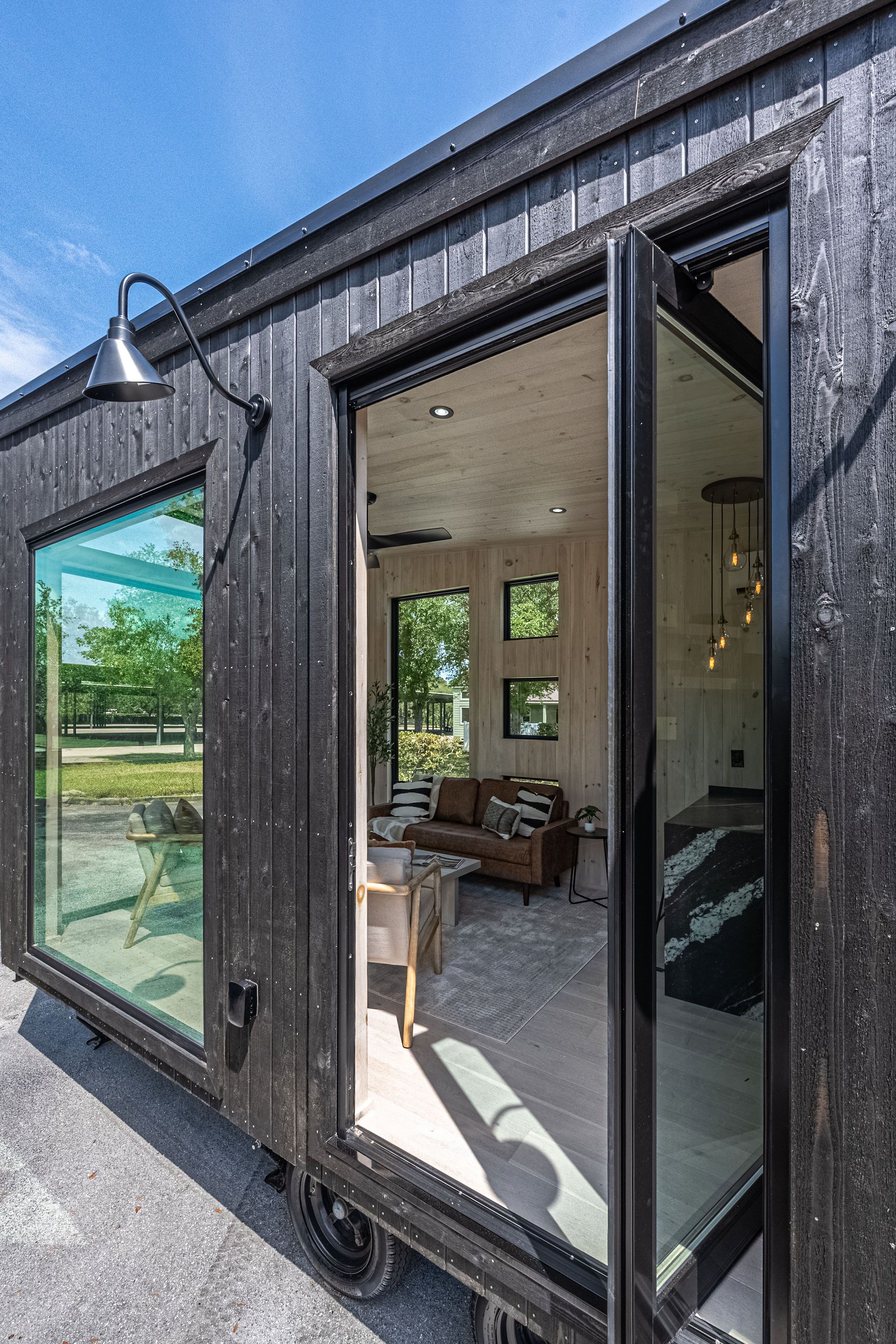 Outside, the Bozeman makes a strong visual impression with its dark-stained cedar siding. Inspired by the look of shou sugi ban wood, the siding brings in a warm, natural texture without the maintenance that typically comes with charred finishes. A large glass pivot door adds a clean, modern touch while letting in plenty of natural light—setting the tone for what’s inside.