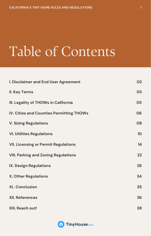 In this E-book, you'll find the information you need to get a solid handle on Californian's Rules and Regulations of Tiny Homes. With over 39 pages of in-depth knowledge, you'll be guided on how to navigate the challenges of regulations. California offers various options for individuals considering tiny home living. Nevertheless, the regulations governing Tiny Houses on Wheels (THOWs) differ across cities and counties, with some places imposing more stringent requirements than others. Learn all about which cities and counties are most tiny home friendly and which ones to avoid.