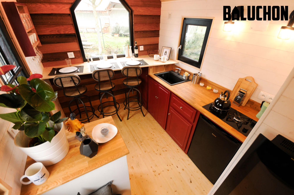 The gable roof is a smart choice for a tiny house as it creates an illusion of taller interiors and also prevents rainwater damage. This is an extremely long lasting asset of the Calypso that makes this house even more desirable in the market of tiny houses. Wooden planks laid horizontally in the external facets of the Calypso create a clean lap siding look that adds a touch of elegance to this house. The interiors are just as winsome as the exterior and you get abundant elbow room left for your comfort after the indoors have adapted to a commodious layout.