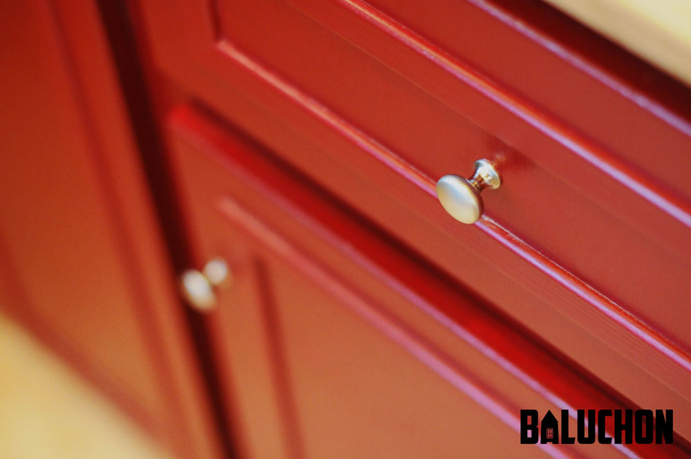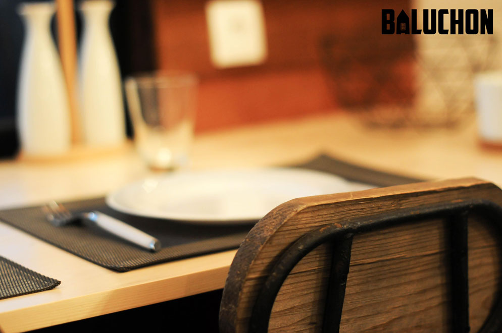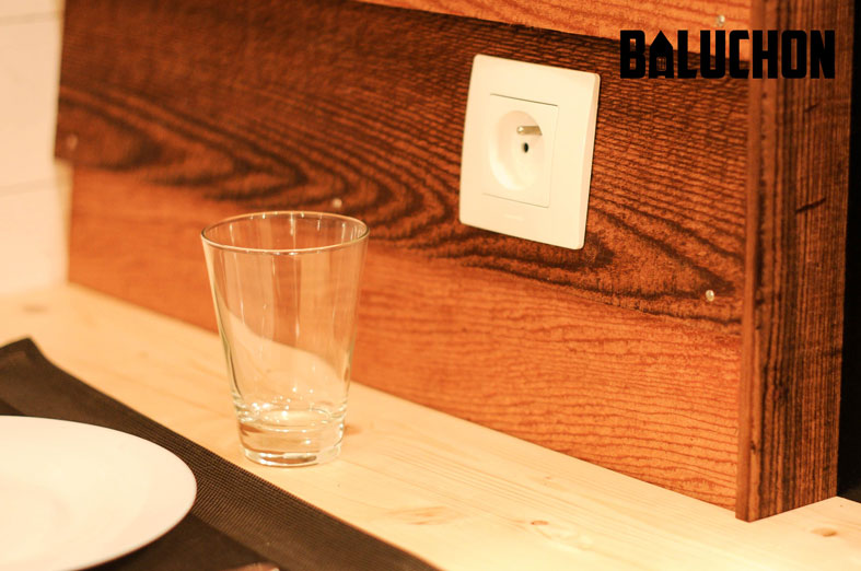 The single yet sturdy kitchen counter is adjoined to the dining table on one side, creating an L-shaped structure that is positioned in the corner of the kitchen. This position allows the residents to have all the space to cook comfortably without feeling congested in a limited space. The kitchen is equipped with a sink and a faucet combination, a two burner stovetop and a chest style fridge that is adjusted next to the cabinets and drawers underneath the countertop.