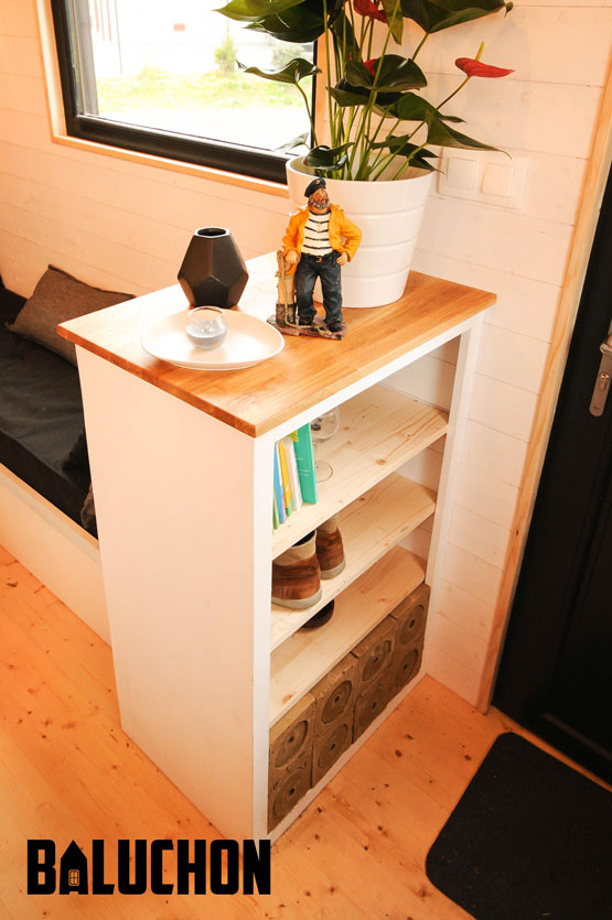 The main bedroom loft has a long flat wooden plank extended on the entrance side that can be used for stacking any extra belongings of the residents. The loft is big enough to hold a queen size mattress that can sleep up to two people comfortably. There are two windows installed on either side of the mattress that keep the sleeping loft well-lit and warm during the day while also letting the occupants enjoy the outside world’s views. The kids’ room is at the end of the house and bears an elevated bed with two wardrobes below it to complete the look.