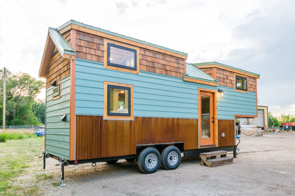 The exterior of this tiny house is not only attractive but calming at the same time. Brown walls with green paint in the middle are making this house look adorable. There are a couple of windows for ventilation and lighting purposes. This tiny house is a gooseneck type of house with a bedroom, bathroom, kitchen, and living space. The living space is over the gooseneck and looks very chic. You will see plenty of LED ceiling lights throughout the house.