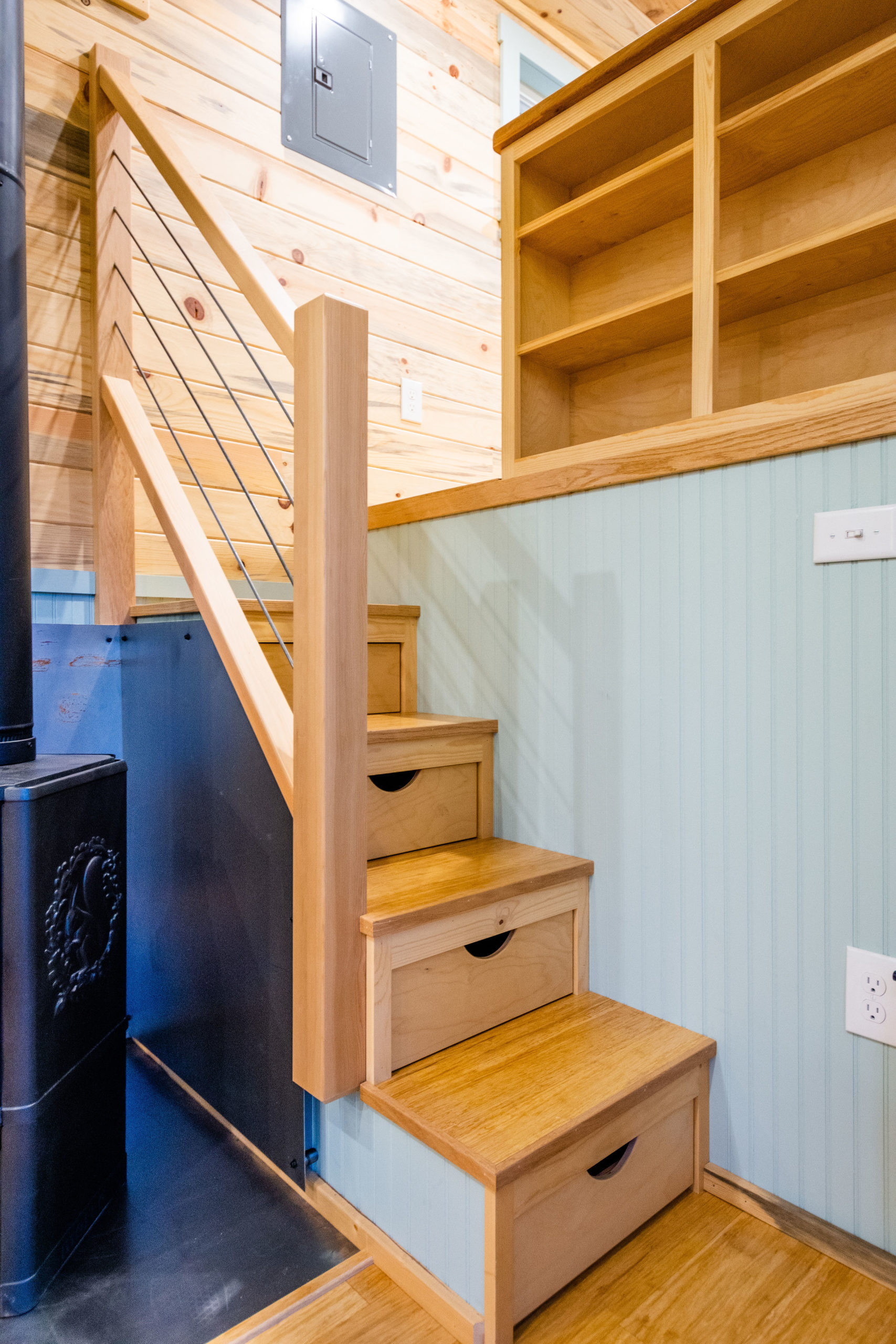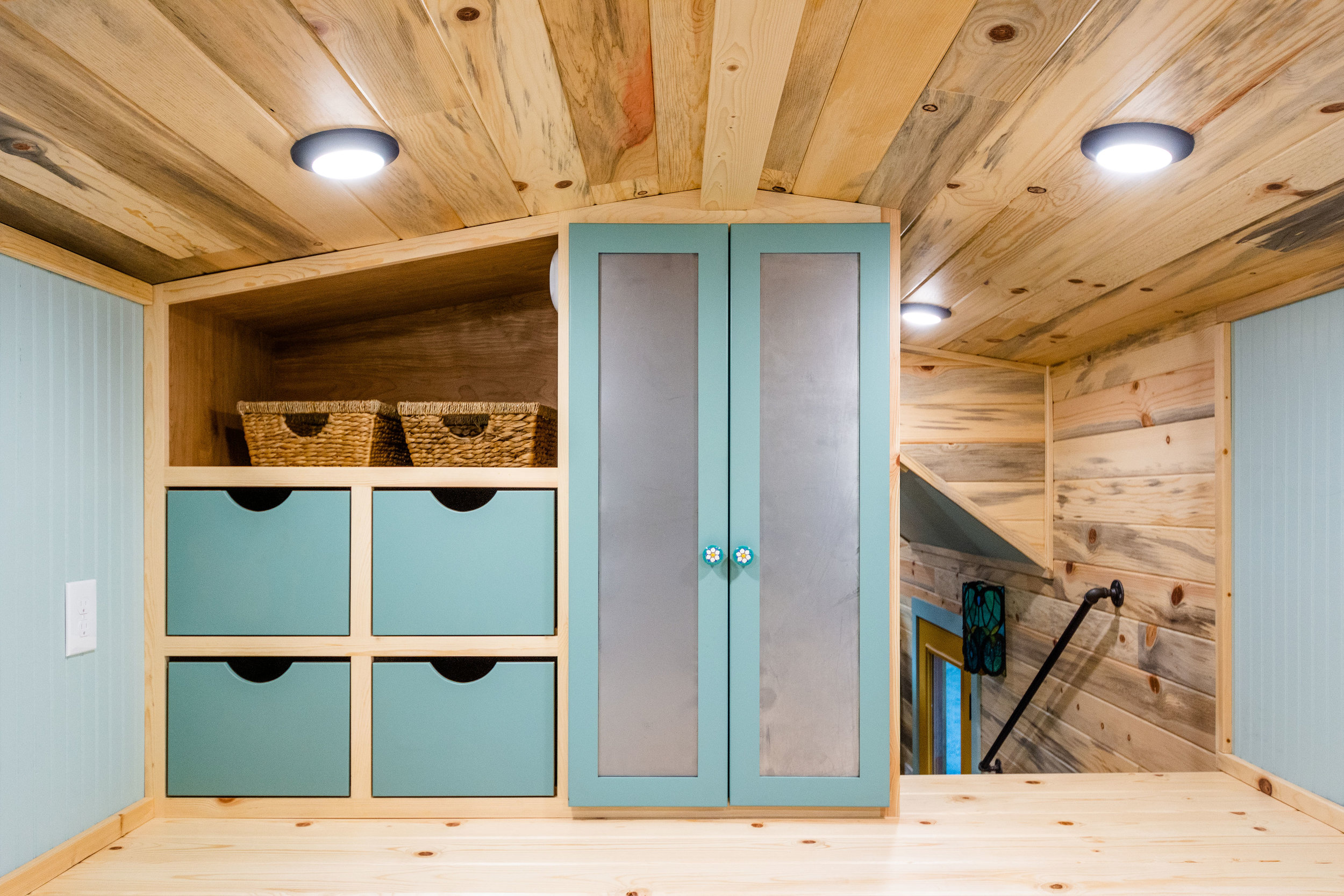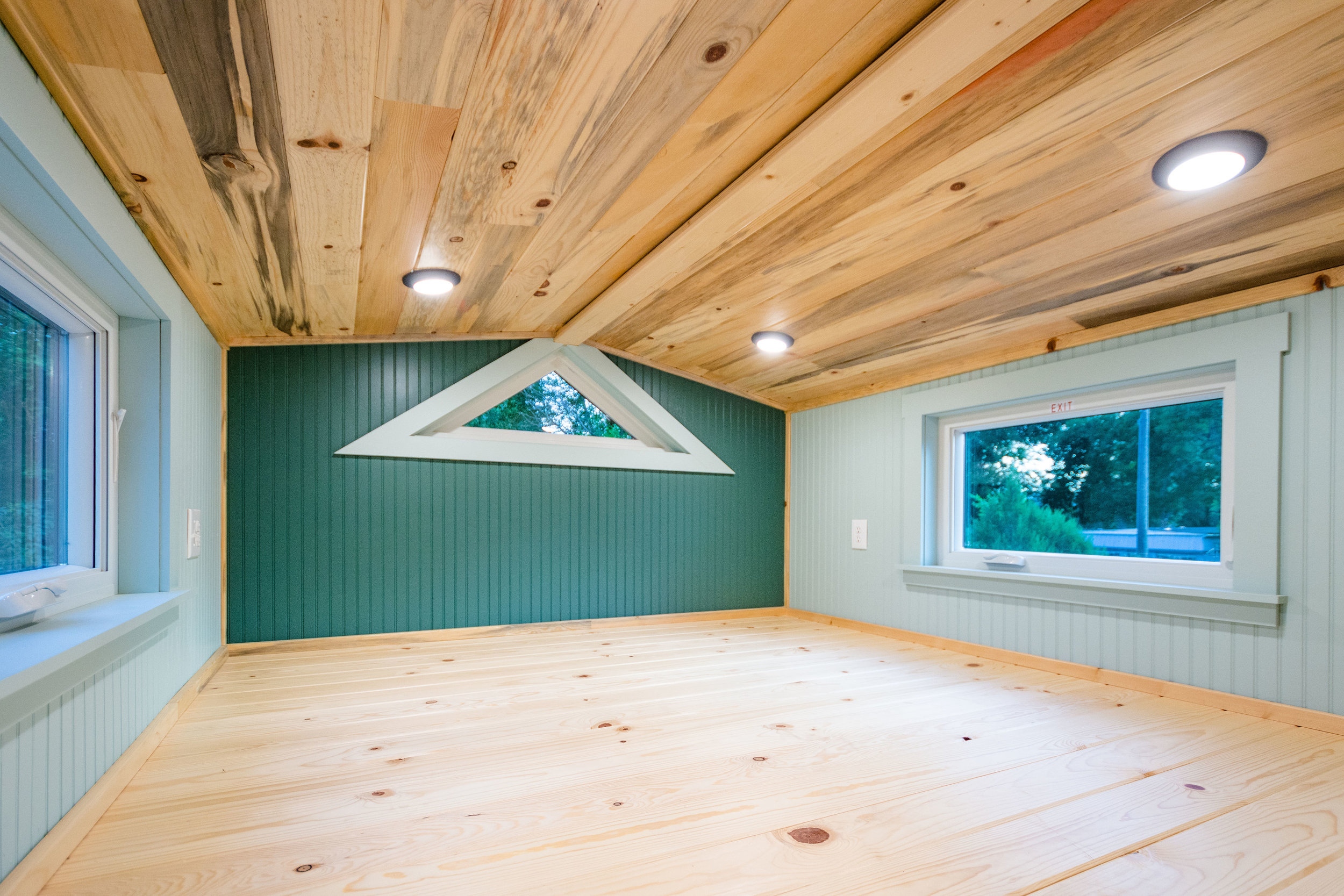 The bedroom is pretty simple but chic at the same time because there is a lot of storage option available for storing your clothes and accessories. you get a beautiful green door closet in your bedroom. The headspace in the bedroom loft is pretty fine and there two rectangles and one triangle window in the bedroom. The storage staircase can store your essentials in there.