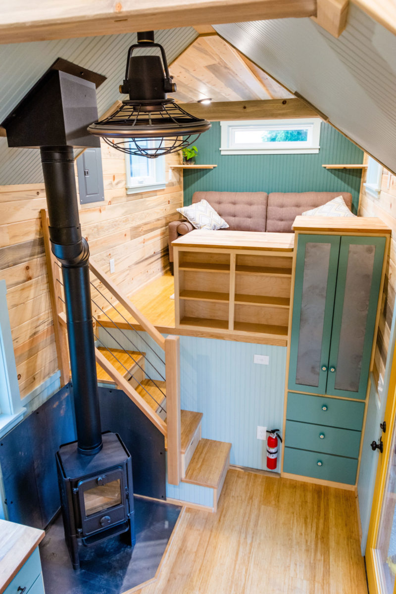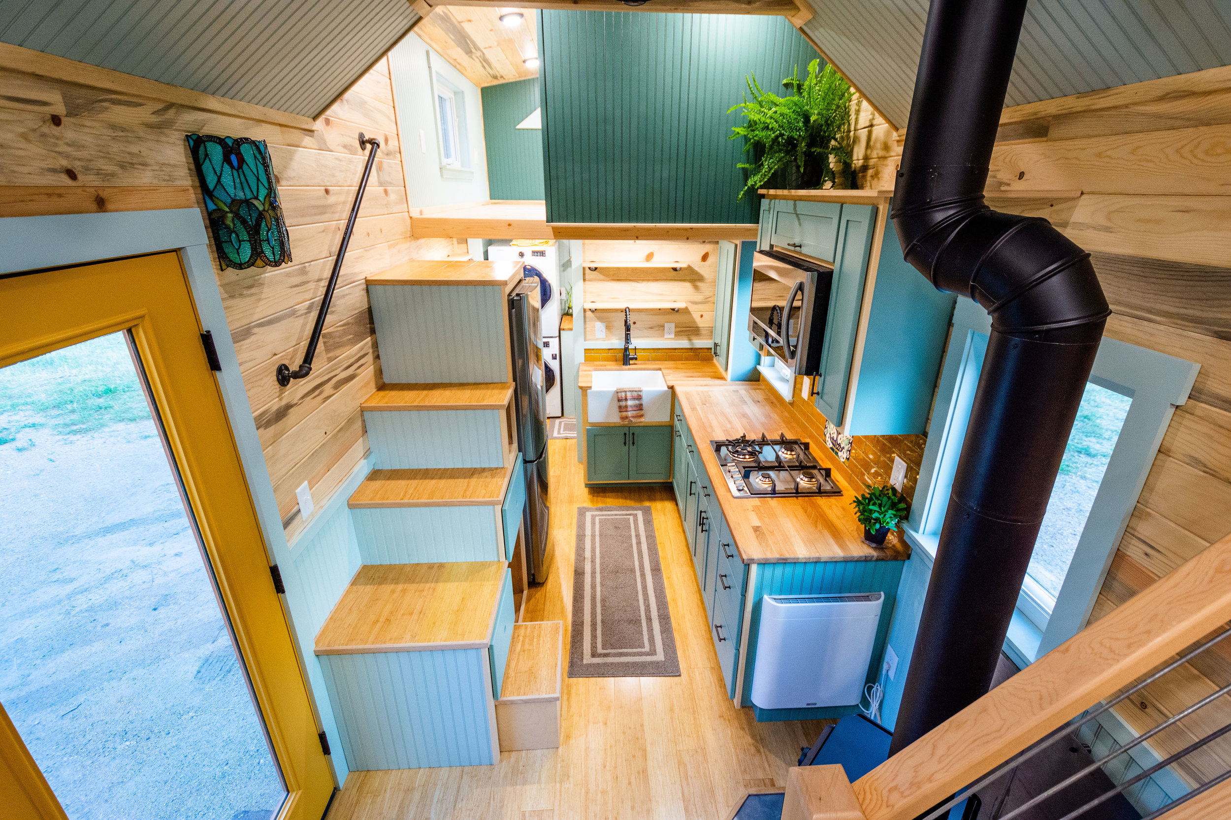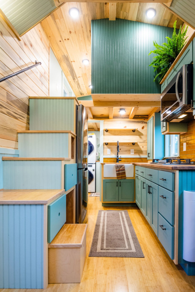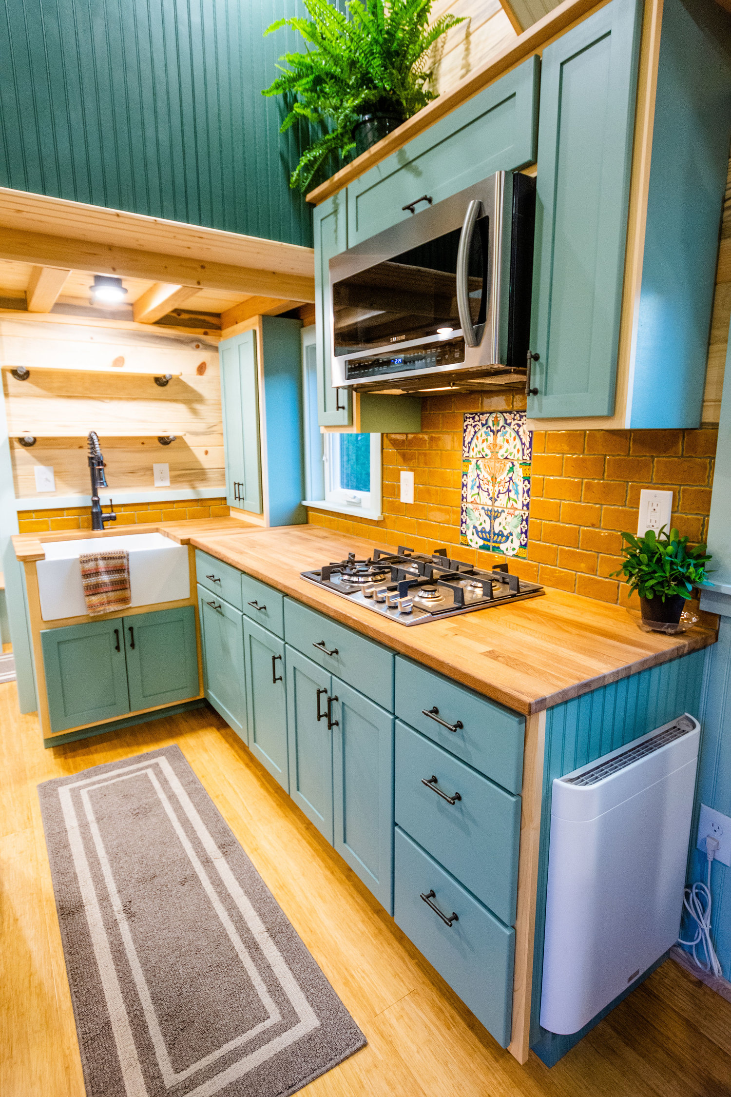 As soon you enter this tiny house via a full glass door with wooden borders that makes it look very elegant. In the middle of the house, you see a kitchen colored in green. The light brown wood flooring is there throughout the house and makes this house look elegant. The kitchen comes with a gas burner, hood, microwave, L-shaped countertop, a big white sink with fossils, and storage compartments. There is plenty of storage options available in the kitchen for groceries to utensils, one can put a lot of stuff in there. The burning stove below the kitchen makes your tiny house warm.