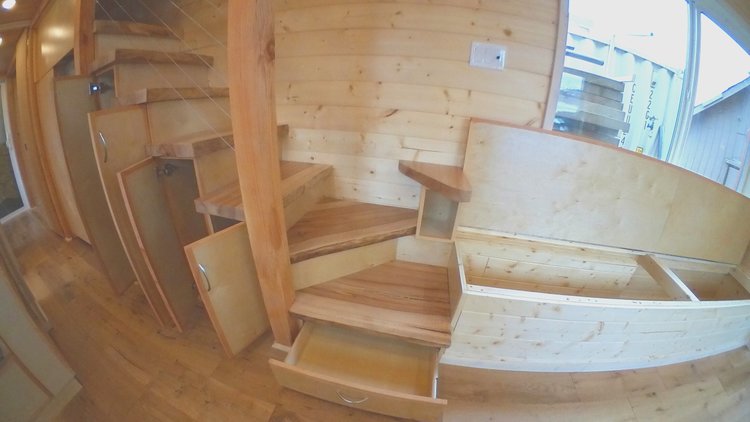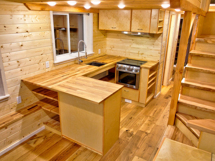 The interiors follow an enchanting cedarn theme and emulate the elegance of a forest retreat cabin. The layout is strategically designed to provide the residents with all the required rooms and amenities while also leaving ample elbow room to give them freedom of movement. The living area is decently sized and offers sufficient relaxing space while the kitchen adjacent to is fairly large for a tiny house and comes with a variety of useful features. The kitchen bears a U-shaped counter with an Oak wood countertop that is finished with Osmo TopOil High Solid which is a food safe finishing material that is known for its excellent water and dirt resistant properties.