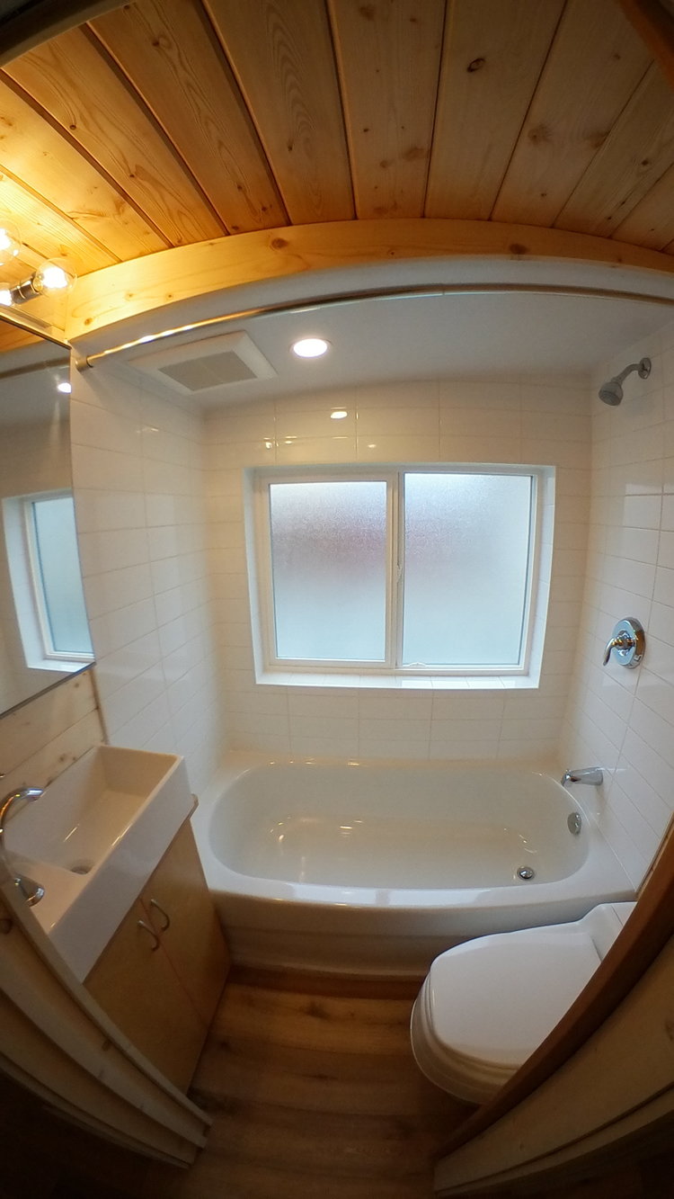 The residents can cook comfortably without having to worry about spilling any liquids such as juice or milk on the counter, as it is an easy to clean and maintain feature. The kitchen counter is equipped with a propane function range and a hood fan combination, a deep sink with an attached faucet and a 5 star 110 V refrigerator. An abundance of storage facility is also found not just in the kitchen but around the house in the manner of in-built open cabinets and drawers. The bathroom is packed with utilitarian parts and accessories. A full size metal bath tub, a 20 inches hand basin, a composting toilet and a unique moisture control shower system complete the bathroom’s look.