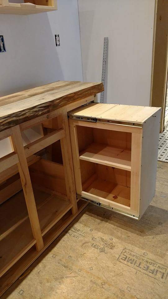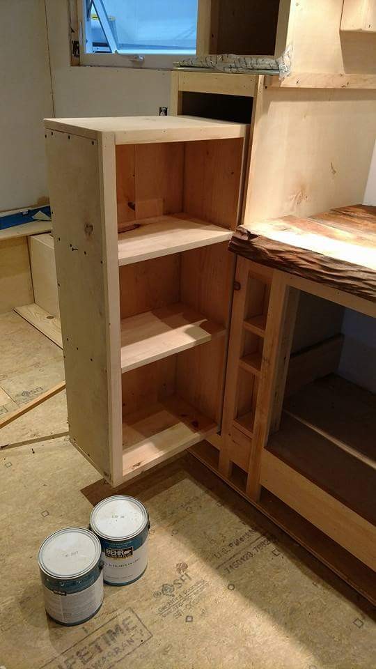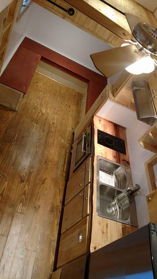 The in-built U-shaped seating platform in the living room doesn’t occupy much space and leaves sufficient elbow room to avoid making the area appear overcrowded. The open kitchen holds a hickory countertop with a two burner gas stove, stainless steel sink and faucet combination, a convection oven and multiple cabinets neatly stacked for extra storage. The designated place for placing a refrigerator is next to the countertop.
