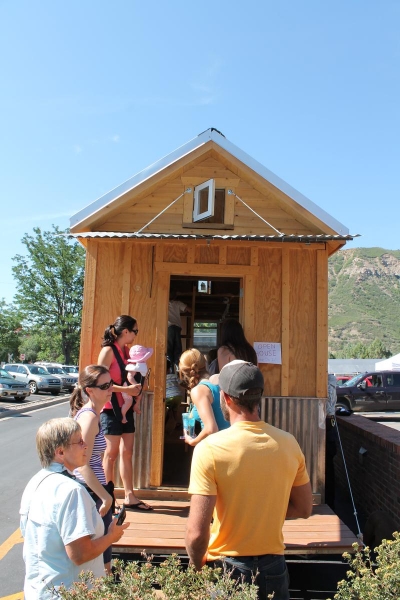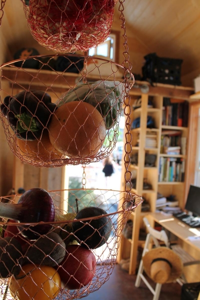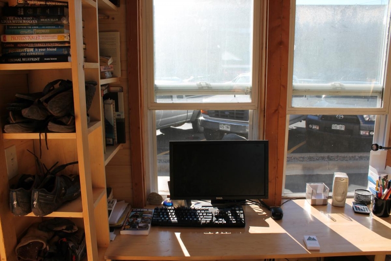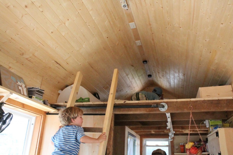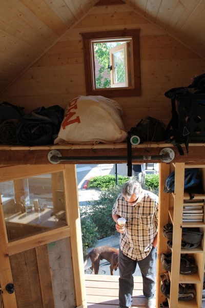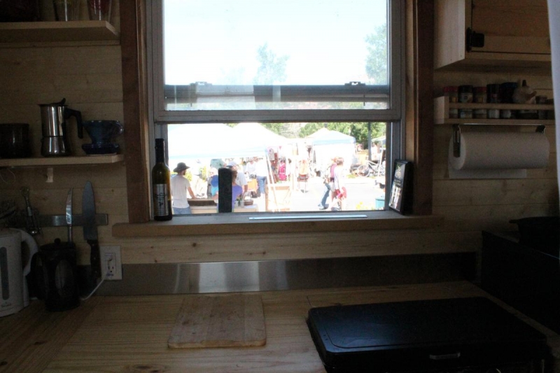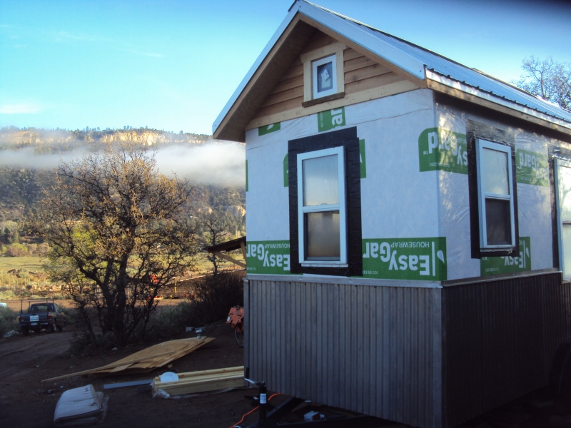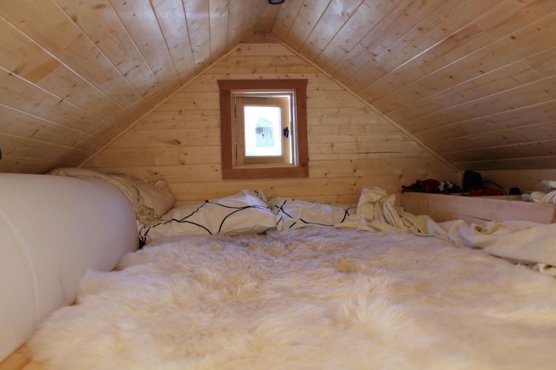 This is the first tiny house model I designed and built for myself, and very un-originally, I named it for the town it was built in as well as where the tiny house company was founded and is currently located. It is built on a standard 16’ trailer and features a wet bath, open closet, decent sized kitchen, high ceilings, a large desk area with lot of windows, a sleeping loft, a storage loft, a place for a small woodstove, and a fold up porch. You will note a lot of recycled wood in these pictures, as well as several personal accessories. I can certainly provide such items but they are not standard. The exterior tiny house features 3 kinds of siding material: rusty corrugated wainscot, roughsawn pine board and batt, and cedar lap siding in the gables