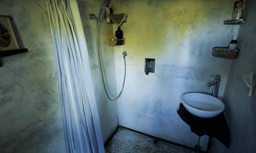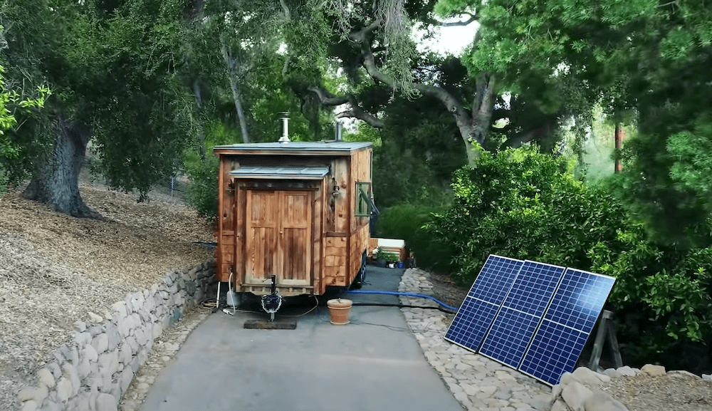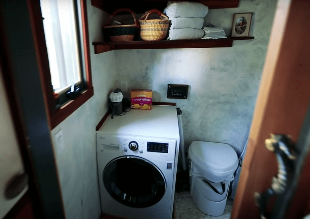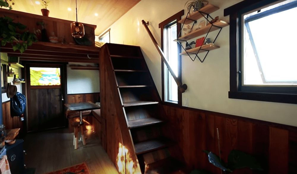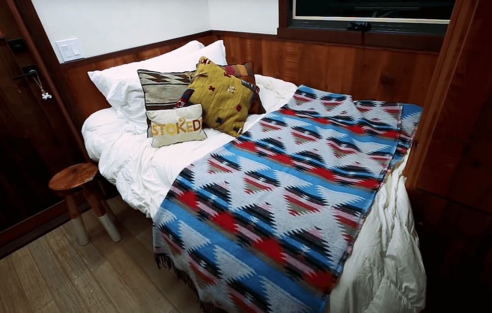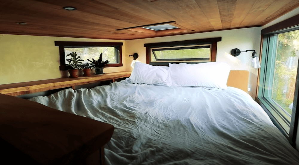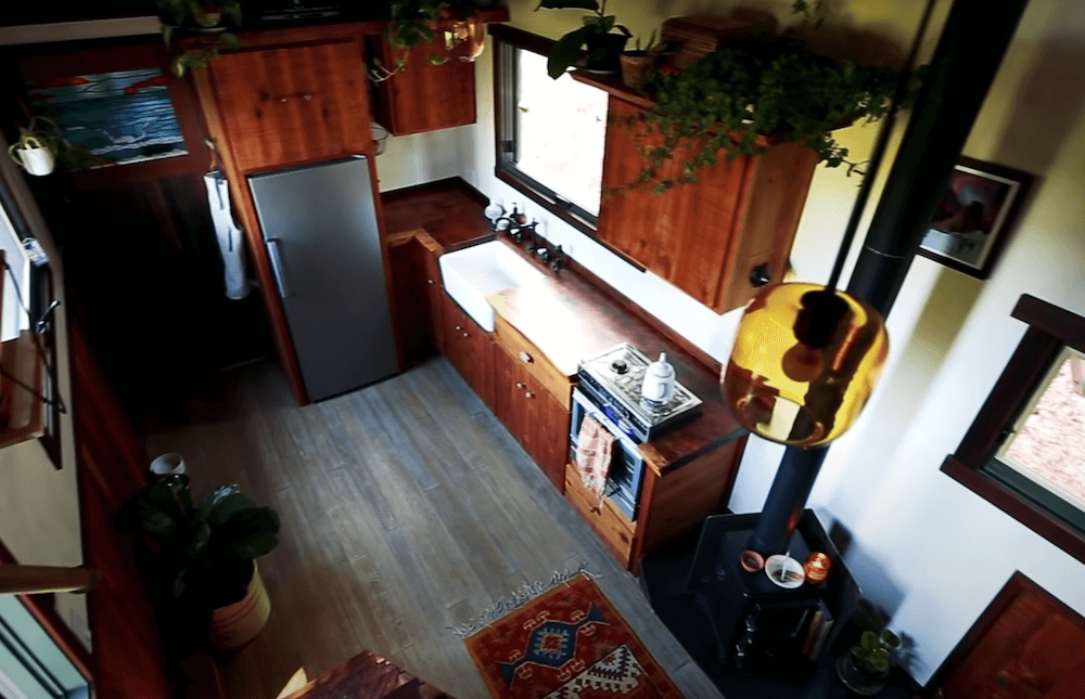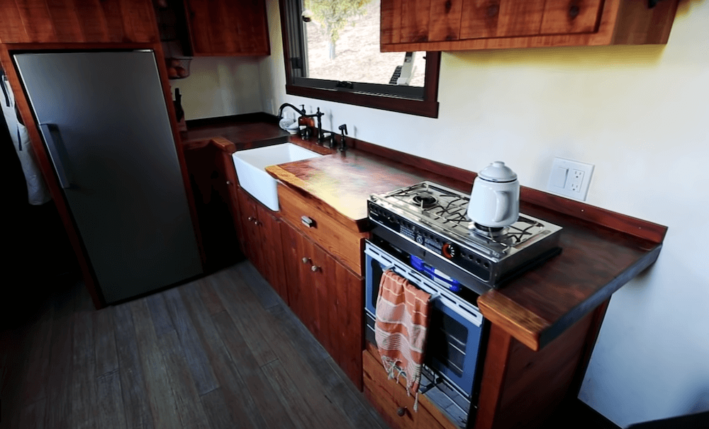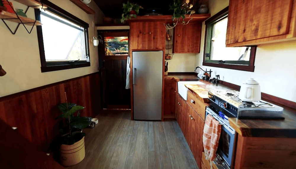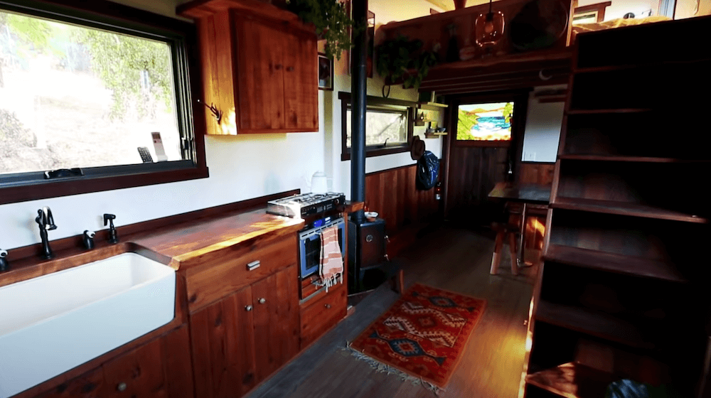 The old growth redwood slab dining table drops down to make a full bed which seems to be a great space saving feature. The twice reclaimed bamboo flooring plays a major part in making the interiors appear winsome. Both the lofts can accommodate up to two people comfortably, making this an ideal home for a small family. There is a wide range of cabinets available that provide you with abundant storage space. The kitchen comes with more than enough elbow-room and a long counter that holds all the required appliances. In the long list of amenities and appliances, you get a mini-split highest efficiency air conditioner, a Hobbit wood stove along with a Nature’s head toilet.
