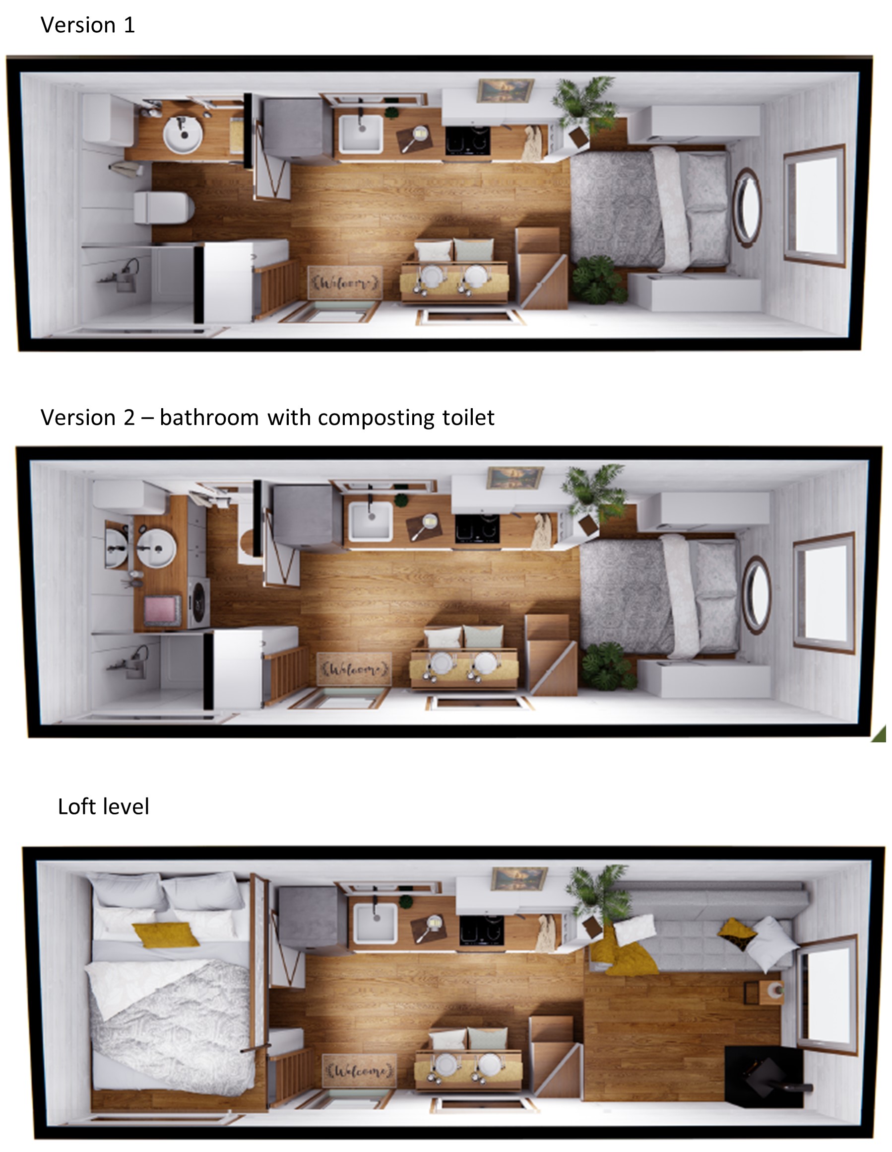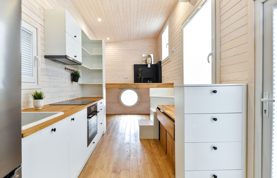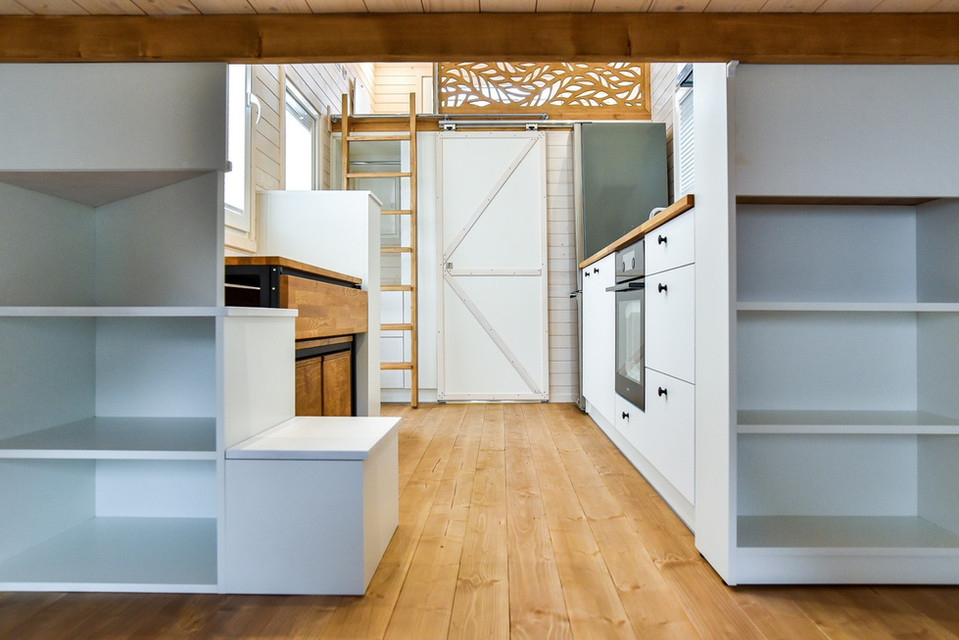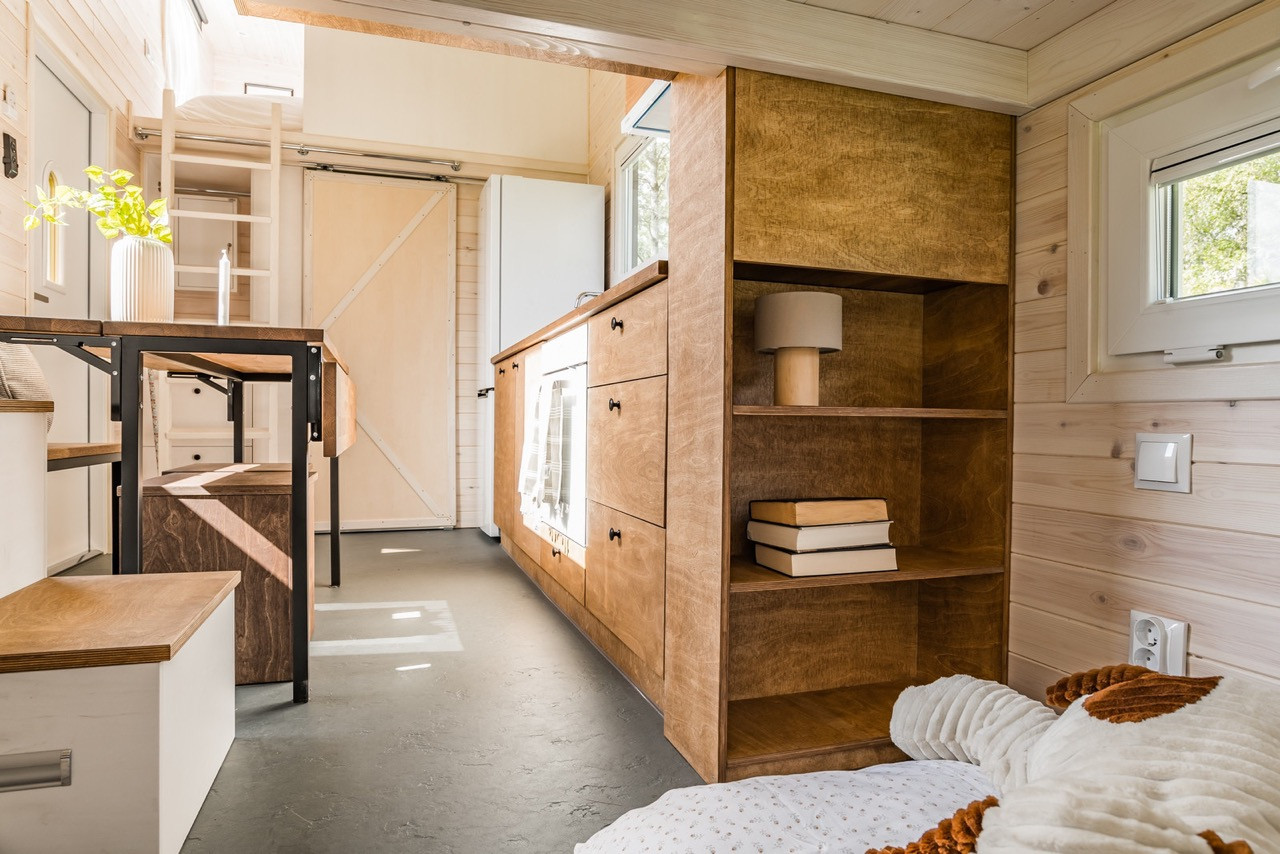Measuring 7.3 meters in length, 2.55 meters in width, and standing 4 meters tall, Elise's exterior is a fine balance of craftsmanship and art. Built on a lightweight trailer, this home can be transported with ease. The exterior is adorned with a choice of spruce, ThermoWood, or Shou Sugi Ban siding, each adding a unique flair to the house's appearance.