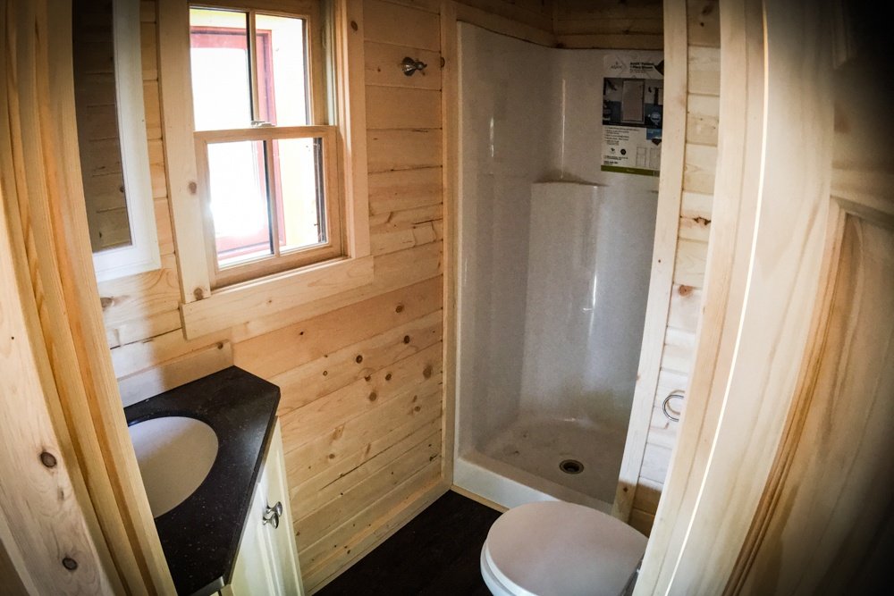 The smart design of the kitchen counter is sure to amaze you as it is strategically equipped with all the necessary appliances-stove, basin, cabinets, oven (optional) etc. A tiny shelf secured on top will allow you to stack your utensils or cereal boxes. Adjusting a fridge and an air conditioner in this tiny house is an easy task and you’ll still find much breathable room left. The adjacent bath and shower facility is spacious with a built-in fiberglass wall shower, granite countertop sink and a compact commode seat. A cabinet beneath the sink and a mirror on top complete the look.