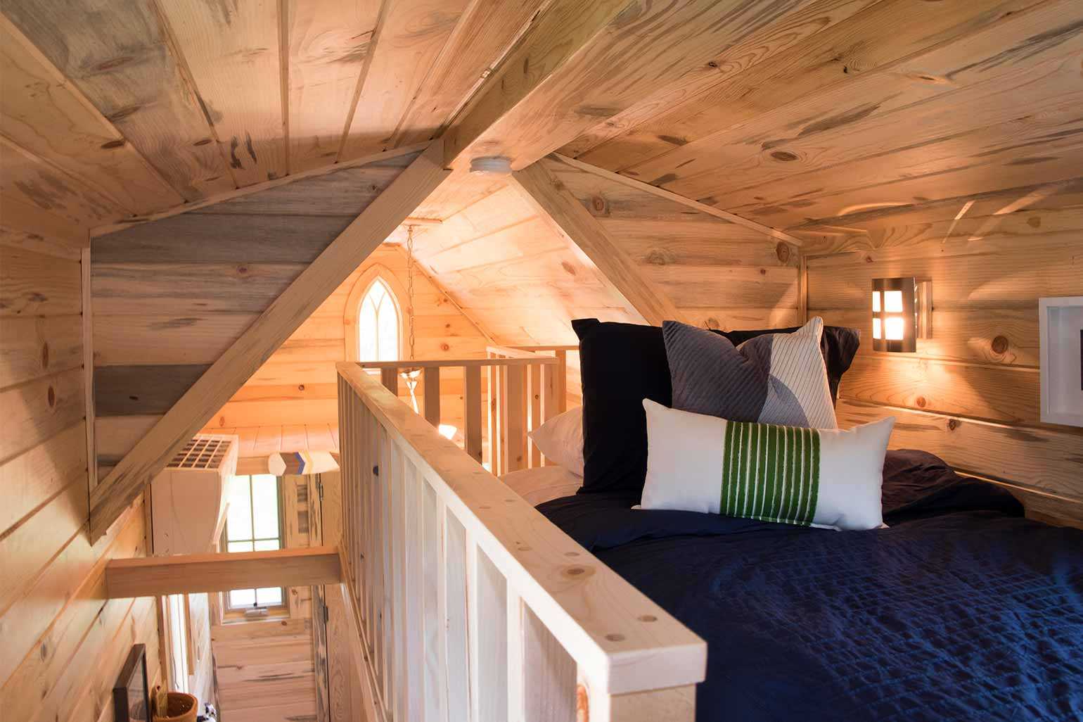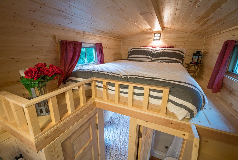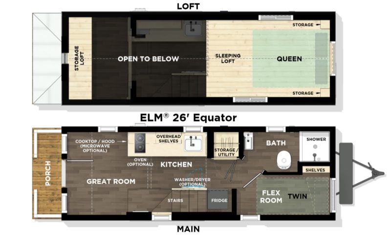 The ELM offers a loft bedroom that accommodates a queen-sized mattress and is attached with versatile storage space which can be used to set up a television set or simply for decoration purposes. The two attic windows fill the loft with sunlight-brightening the aura. You can descend the detachable stairs and enjoy lounging in the great room on a loveseat sofa. It can be converted into a study as well and a small table can be well utilized in this setup.