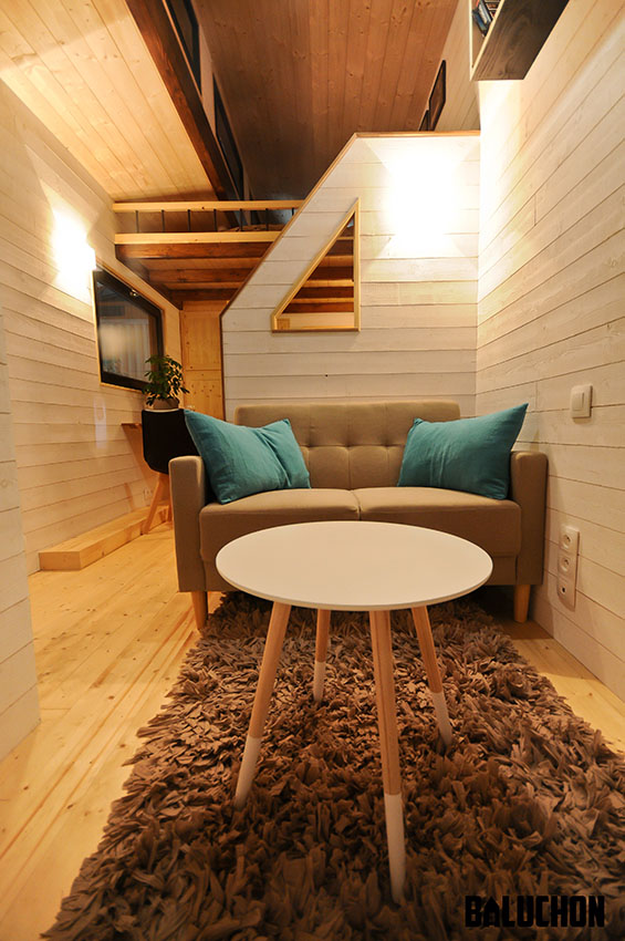 The living room section is secluded from the rest of the house by a separator and here you get a small single sofa along with a circular coffee table for extra support. The main floor is quite spacious and allows the residents sufficient elbow room to navigate comfortably around the house. A tiny dining table is affixed in the wall that comes with two chairs on either side of it to fulfil its purpose.