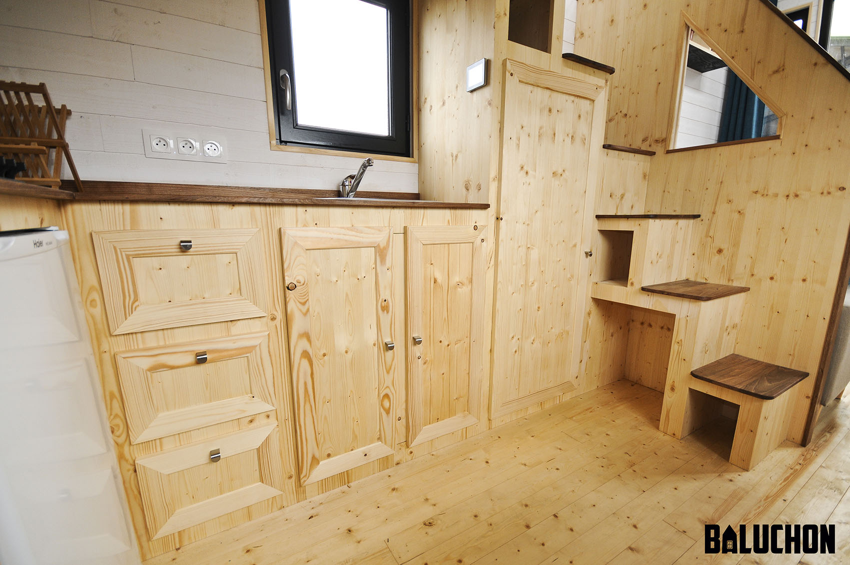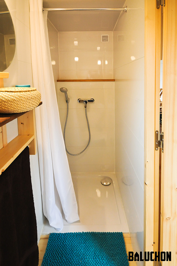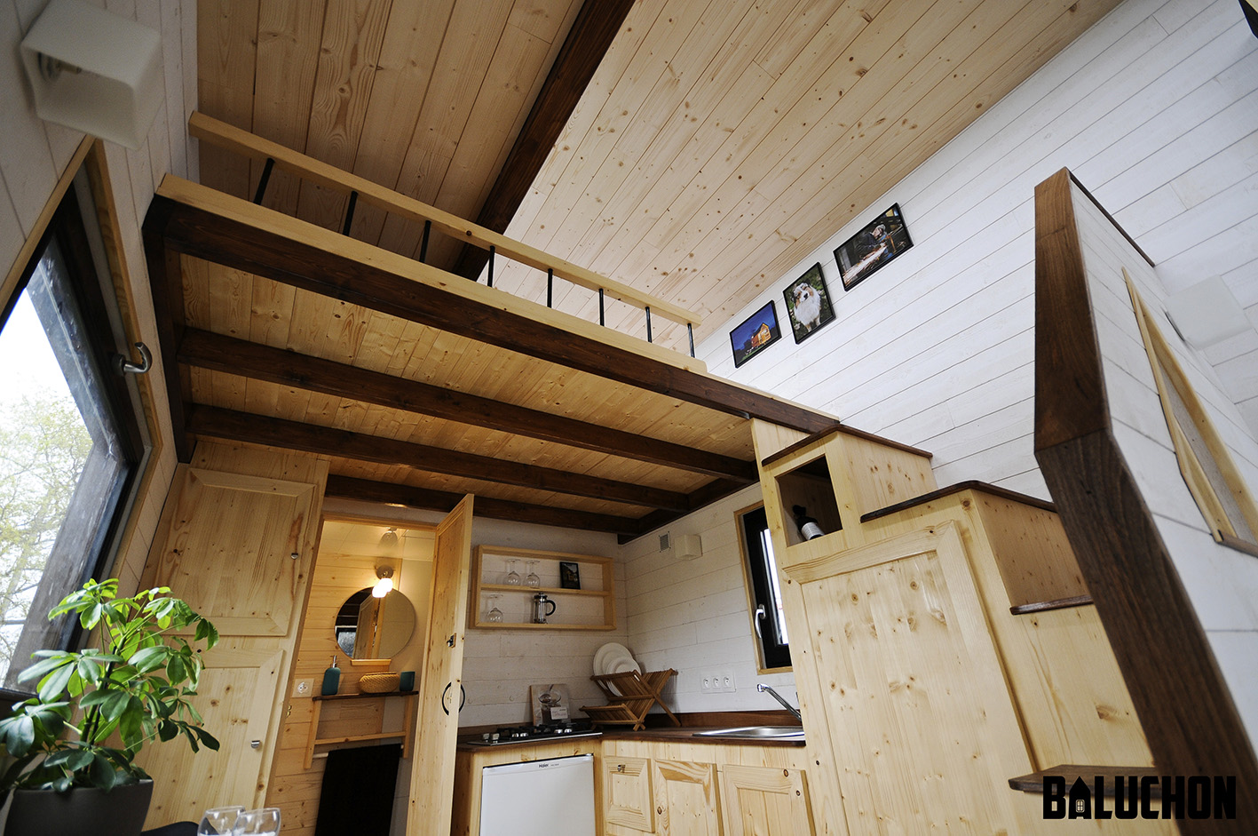 The wall opposite to the dining table bears the kitchen counter that is equipped with a stainless steel sink and faucet and also a two burner stovetop along with an array of drawers and cabinets underneath for extra storage. The built-in staircase that is connected to the sleeping loft also has in-built storage capacity to let the residents make use of one feature to solve two purposes at a time. The bathroom is just as stylish as the rest of the house and also provides functional amenities to the residents in the shape of a dry toilet and a snazzy vanity combination with a chic circular mirror to complete the look.