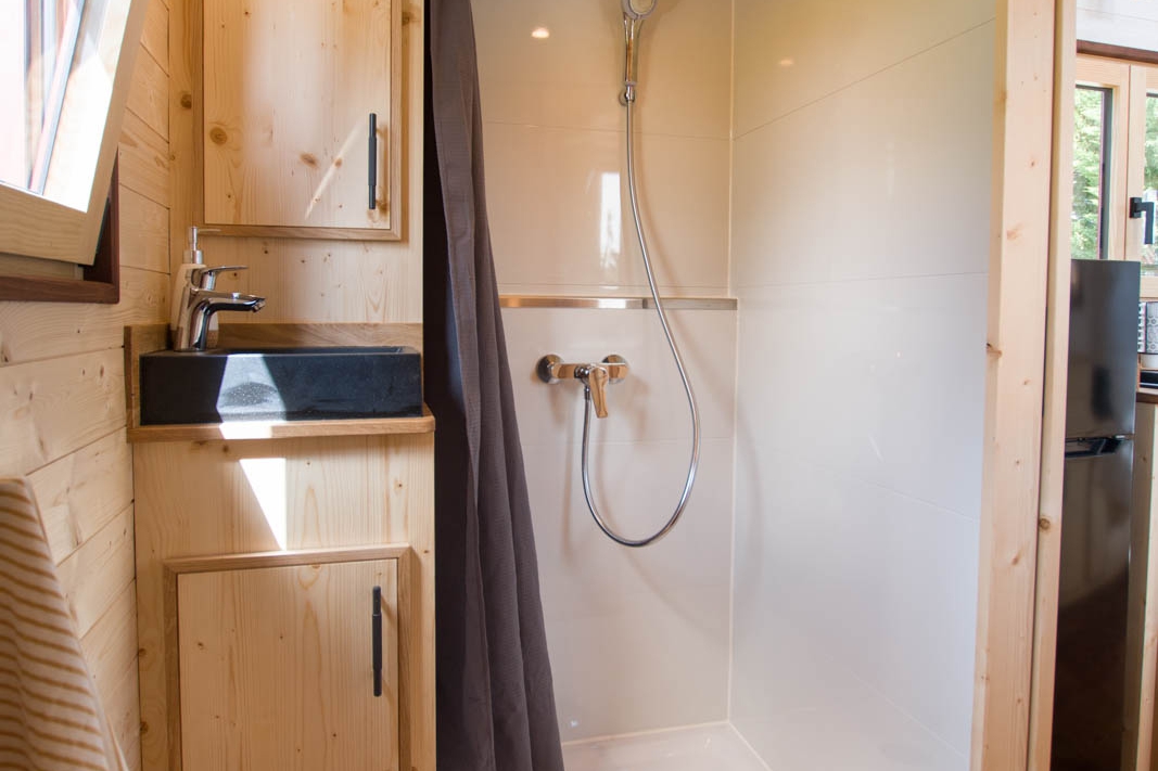 Both the kitchen counters are equipped with several pull-out cabinets and drawers that can accommodate more stuff in a limited space. This is a great space saving feature that makes living in a tiny house more convenient. The most strikingly gorgeous as well as a useful feature of the Farniente is the in-built staircase that goes over the counter and leads you up to the bedroom loft. The stairs at the bottom are adjoined in the counter and have built-in storage space while the remaining floating stairs above the counter not only serve the purpose but also look like an excellent interior décor piece.
