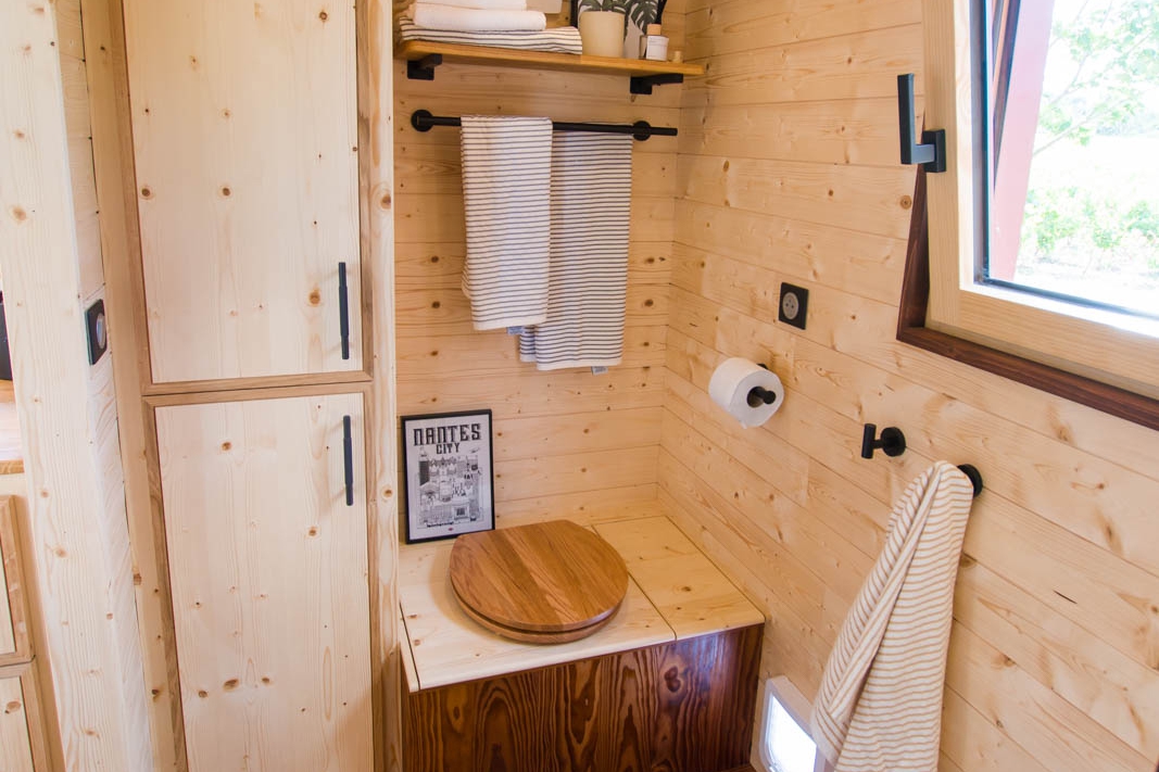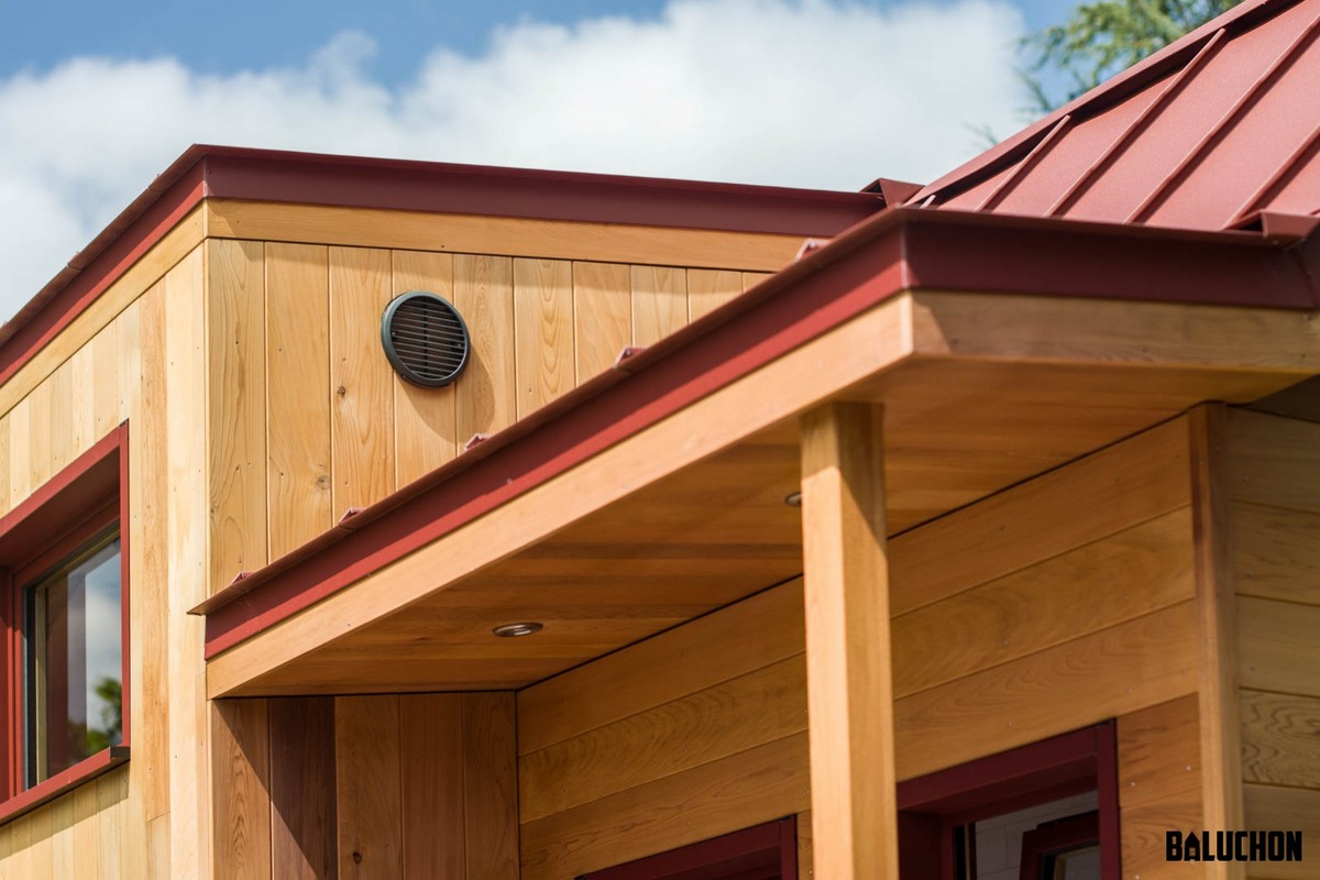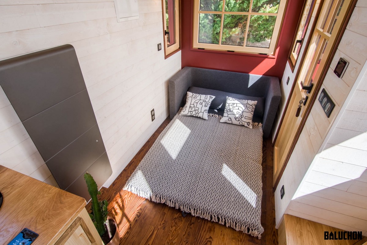 The well-crafted structure of this tiny house on wheels makes it easily transportable albeit commodious. The tasteful colour scheme of the exteriors adds a certain sense of attraction to the house. The combination of radiant red and a subtle brown truly gives the exteriors of the Farniente a winsome touch. The house showcases a dual styled roof where the maximum portion of the house is covered by a straight roof while the remaining portion has a gable roof. The glass windows are an asset as they prove their practicality while also being a stylish feature.
