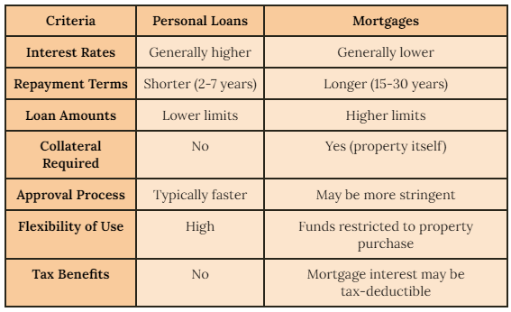 Mortgages generally have lower interest rates compared to personal loans, as they are secured by the property. This can result in significant savings over the life of the loan, making mortgages a more cost-effective option in the long run.