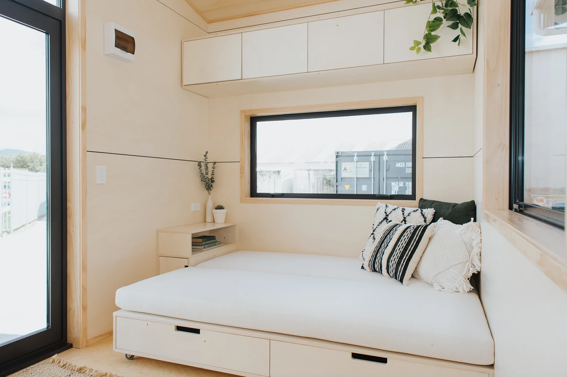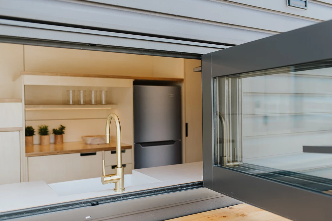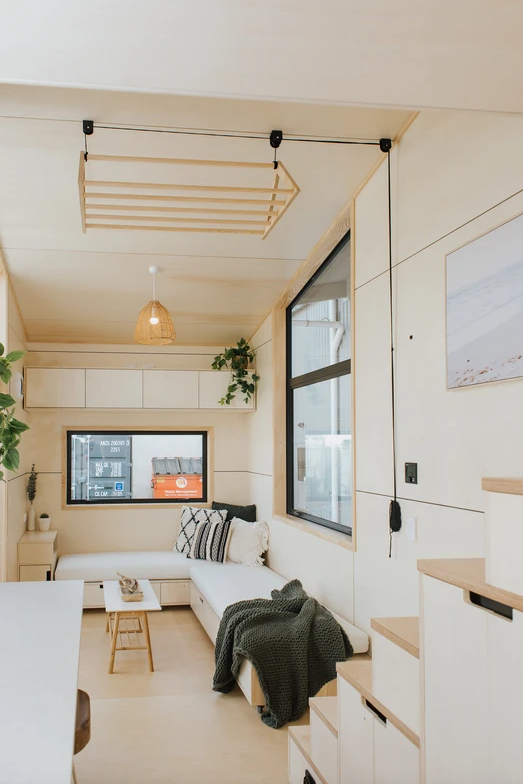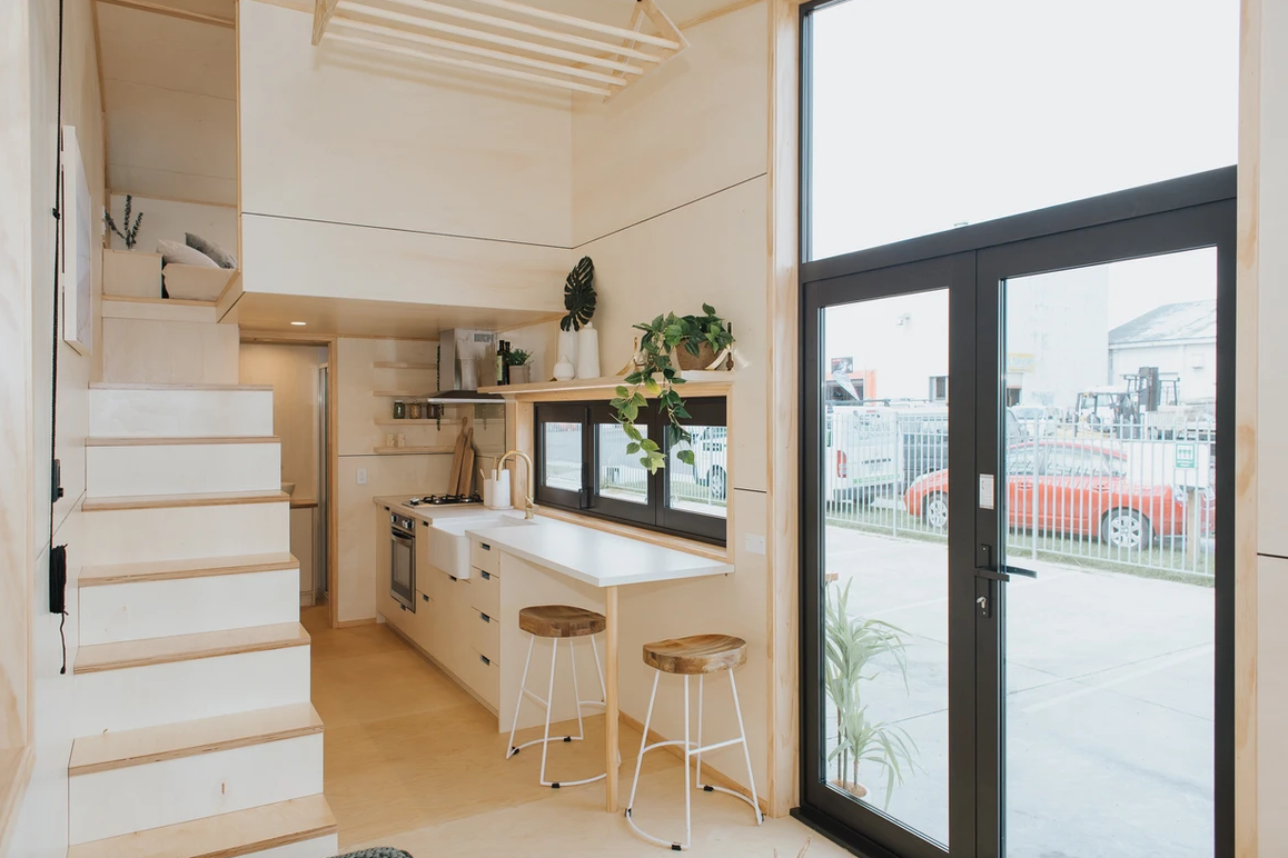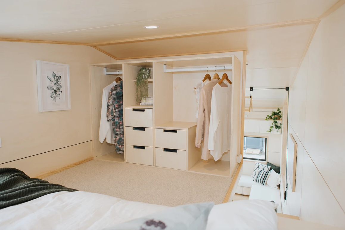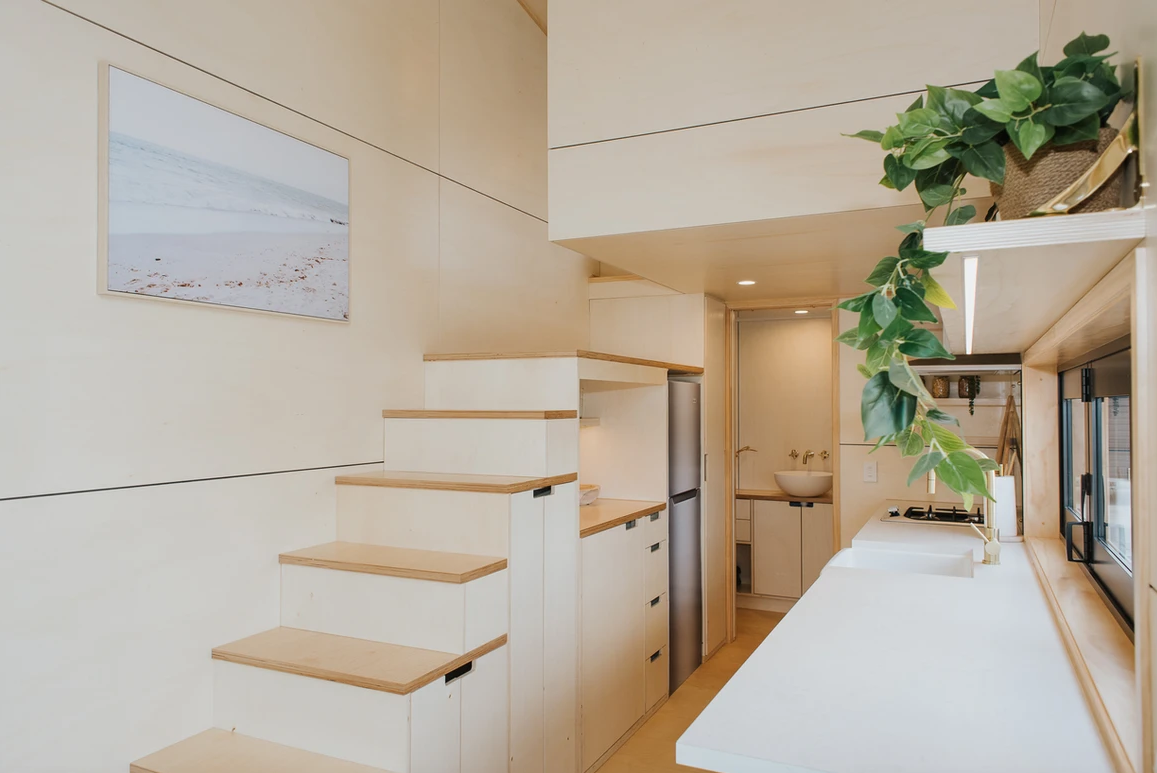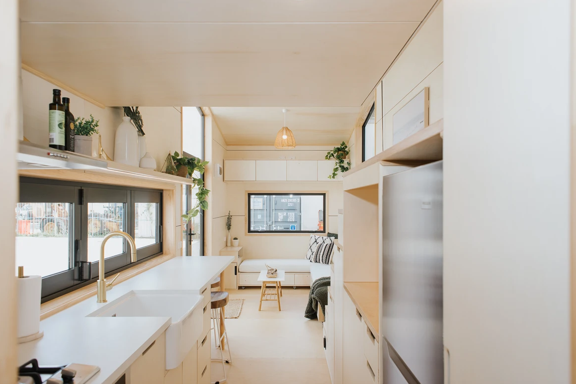 As you step through the door, you're greeted by an interior that reflects the couple's impeccable taste in interior design. The warm varnished poplar plywood walls create an inviting ambiance, while brushed brass tapware and fittings add a touch of elegance. Every aspect of the cabinetry has been meticulously designed and custom-made, ensuring that no corner of the house is wasted. The result is a space that feels both modern and open, far beyond what one might expect from a tiny home.