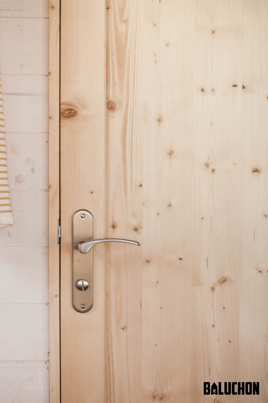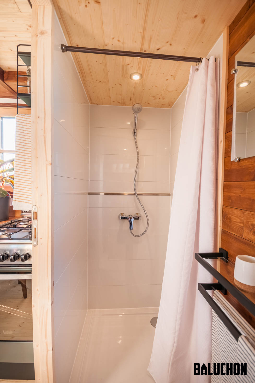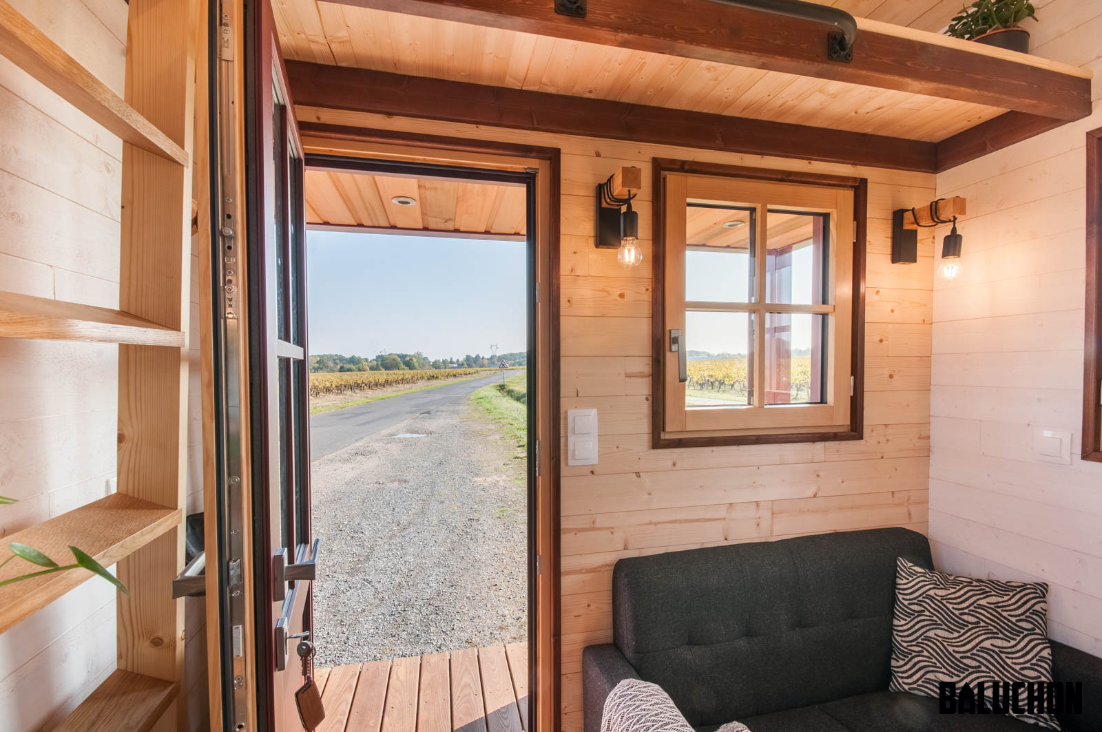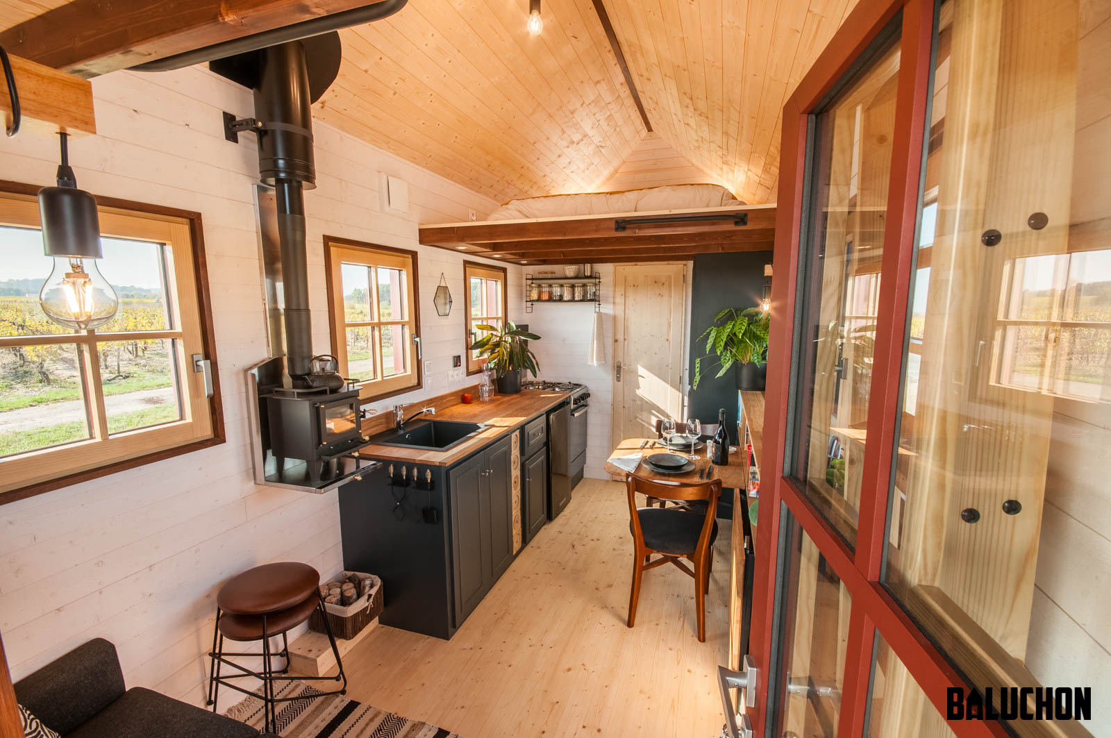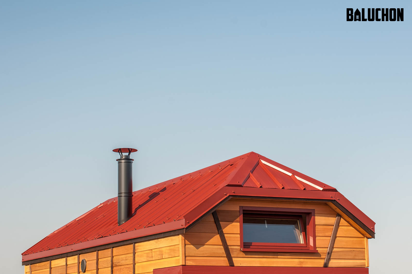 The metal roof prevents the build-up of mold and mildew and remains an easy to clean feature that is also easy to sustain. The cedarn look of the exterior stands true to the house’s name and radiates an enticing appeal. The interiors are just as classy as the exteriors and the house doesn’t lack the style factor that Baluchon is quintessentially known for providing in its tiny houses.