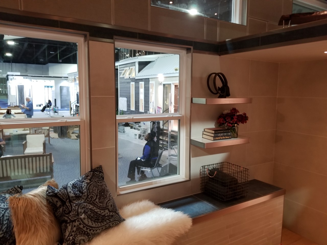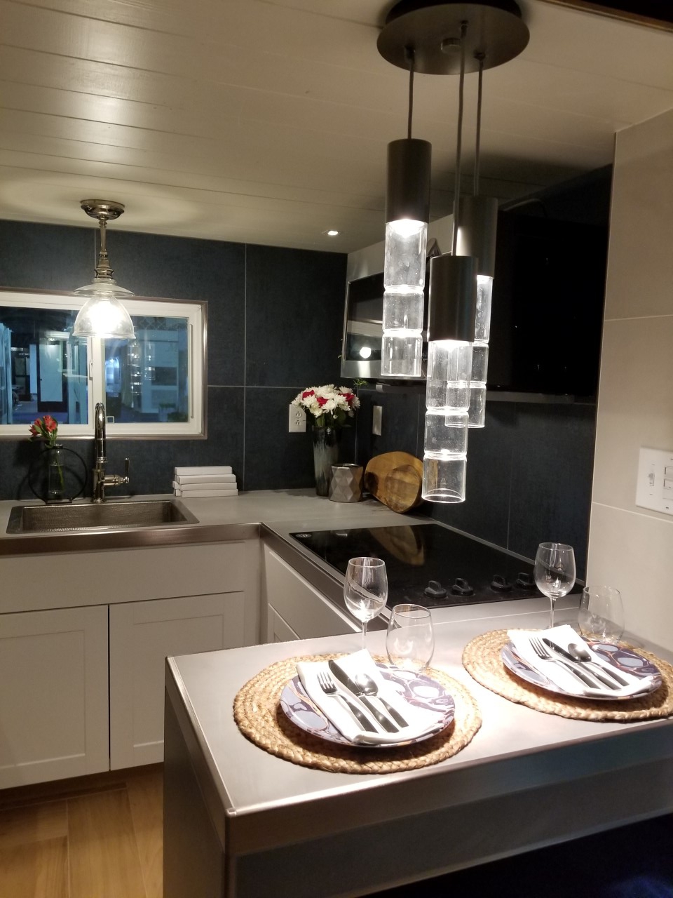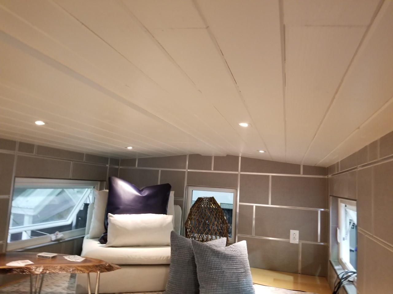 With its distinctly modular design and structure, Jasmine is a beautiful tiny house that is sure to attract attention at first glance. The neutral monotone colour scheme of this RV truly makes the stellar design speak for itself. The immaculate horizontal wainscot exterior, galvalume metal roof, the crisp glass windows that appear frameless and the sleek entrance door form the exterior of the Jasmine. The interior is mainly made up of tiles that are of a dark-light grey combination. The white lap siding ceiling with tiny rectangular inset lights looks elegant and creates an illusion of extensive space.