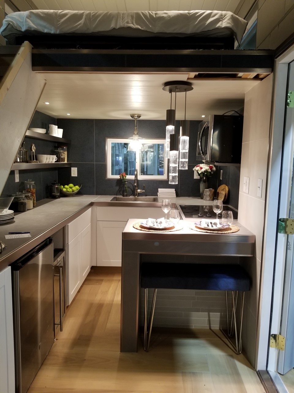 Jasmine is one of the most beautiful and spacious tiny houses one can set their eyes upon. With 350 SF and 30’ x 8.5’ dimensions, it an interior design masterpiece. All the unique features such as the built-in electric fireplace, the built-in seating space in the living room as well as the added countertop in the kitchen which can be used as a compact dining table are wonderful creations. The use of durable materials such as the metal roof, the stainless steel countertop and easy to clean tiles exhibit sheer brilliance in planning and constructing strong houses.