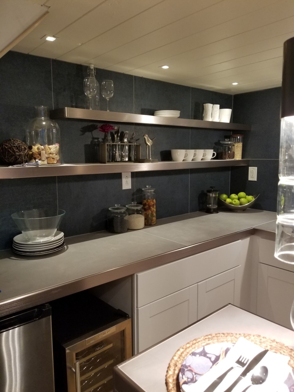 The U-shaped kitchen is equipped with efficient amenities and looks trendy. The burnished stainless steel countertop is very nifty as it can effectively survive the impact of knives and other kitchen appliances as well as remain fire and rust proof. The two single open thick metal shelf planks are elongated across one side of the kitchen counter and serve well for stacking fine glassware or kitchen plants. The additional countertop that poses as a small dining table reflects operational intelligence. The neat array of cabinets in the kitchen look chic and are decently sized for storage purposes.