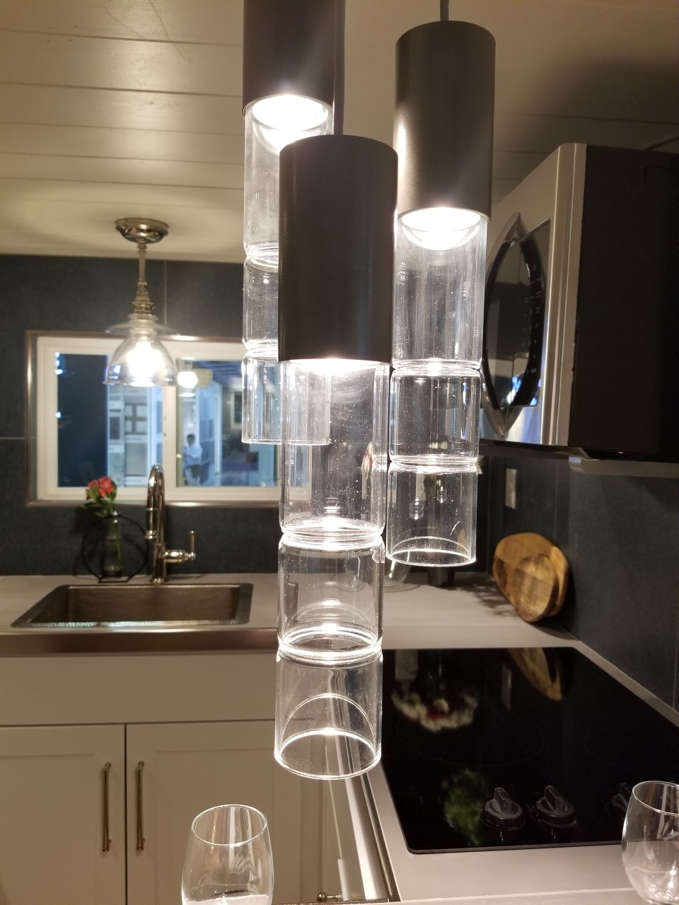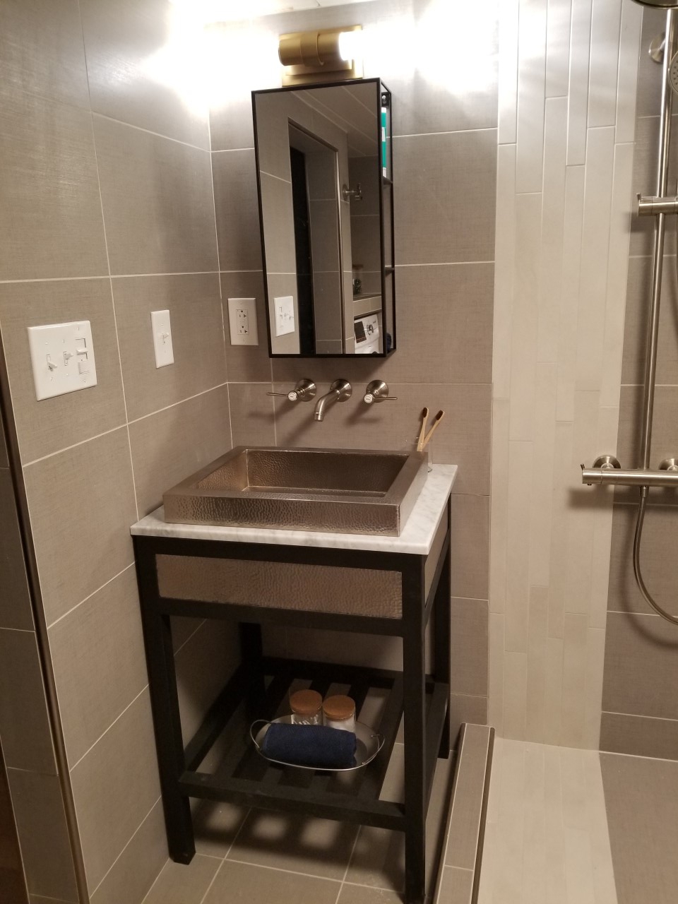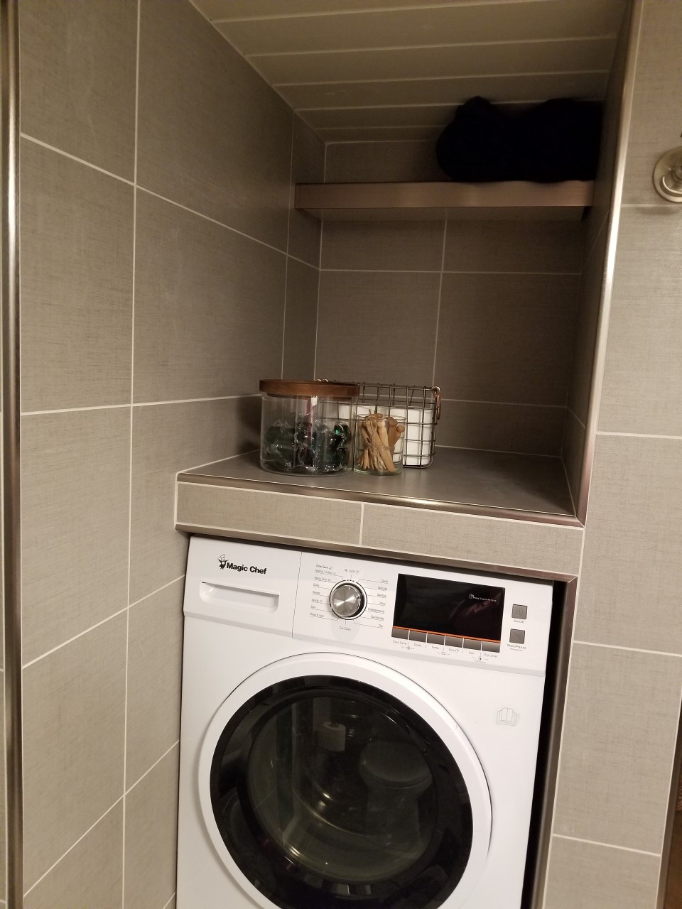 The two expansive bedroom lofts are comfortable and each loft can surely accommodate 2 people conveniently. The lofts are roomy and let you place a queen sized mattress, making it ideal for a nuclear family as it can sleep up to 4 people. The single bath is built beautifully with a European style shower. You get a bathroom compartment in the tiled wall to keep your toiletries while taking a bath. Additionally, you have washer/dryer space with extra room on top for hanging bathrobes and clothes. The adjacent hammered copper washbasin adds a vintage look to the otherwise minimalist bathroom. You have vanity space for stashing medicine and other bathroom supplies.
