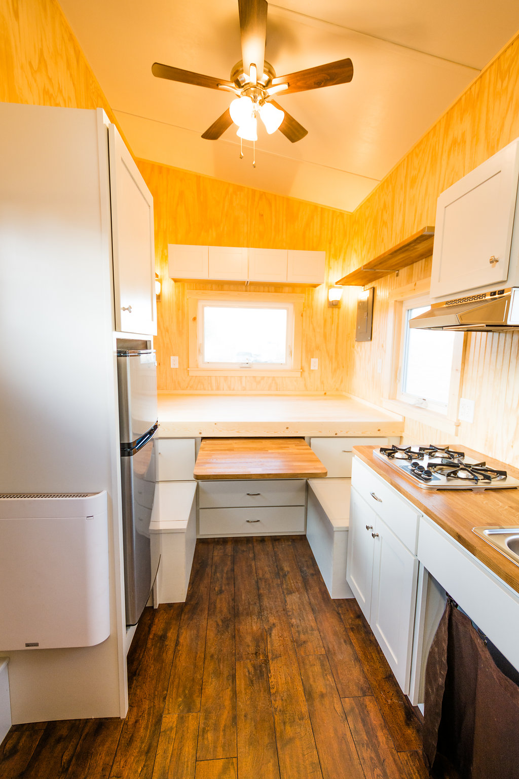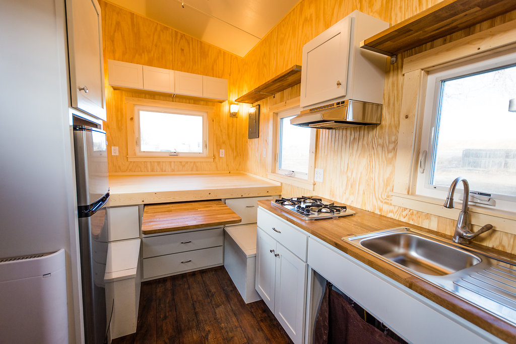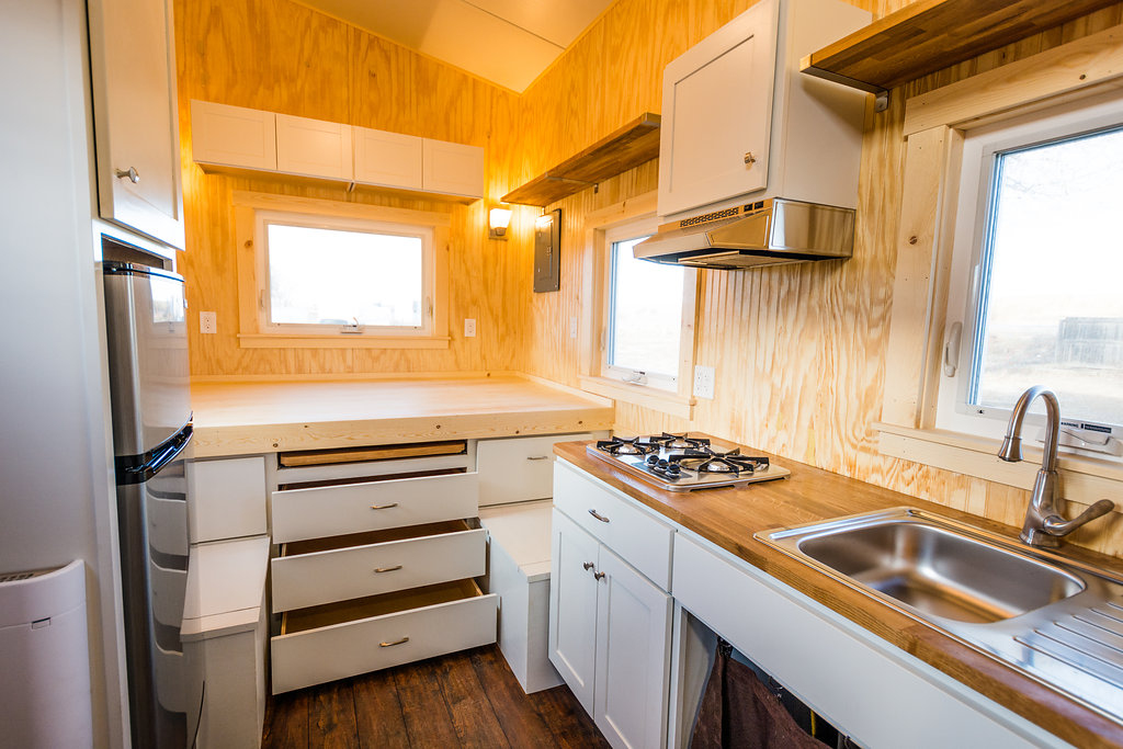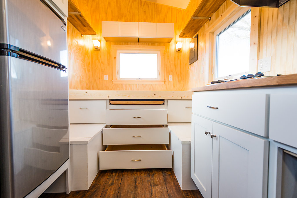 Jessica’s by MitchCraft is a tiny on-the-wheel house that features a sleeping area, kitchen, bathroom, and living and dining bedding space. This house is pretty modern but doesn’t have a specific living space where you can chill, sit and talk. Then there other plus points of this house like a lot of storage space, sleeping space, a nice and modern kitchen at the same time. The exterior of this tiny house is half brown and half colored in sage green, which looks beautiful. The Interior of this house follows two colors theme that is the woody brown or beige type of color along with white furniture.
