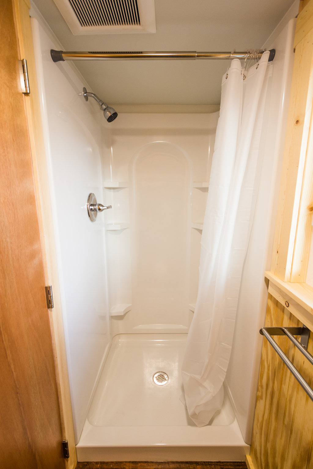 The bathroom is below the sleeping loft and comes with a dry toilet & shower space with a full shower. This bathroom looks average and it is a little compact in size though. But keeping in mind the size of this house, it does go with the house flow.