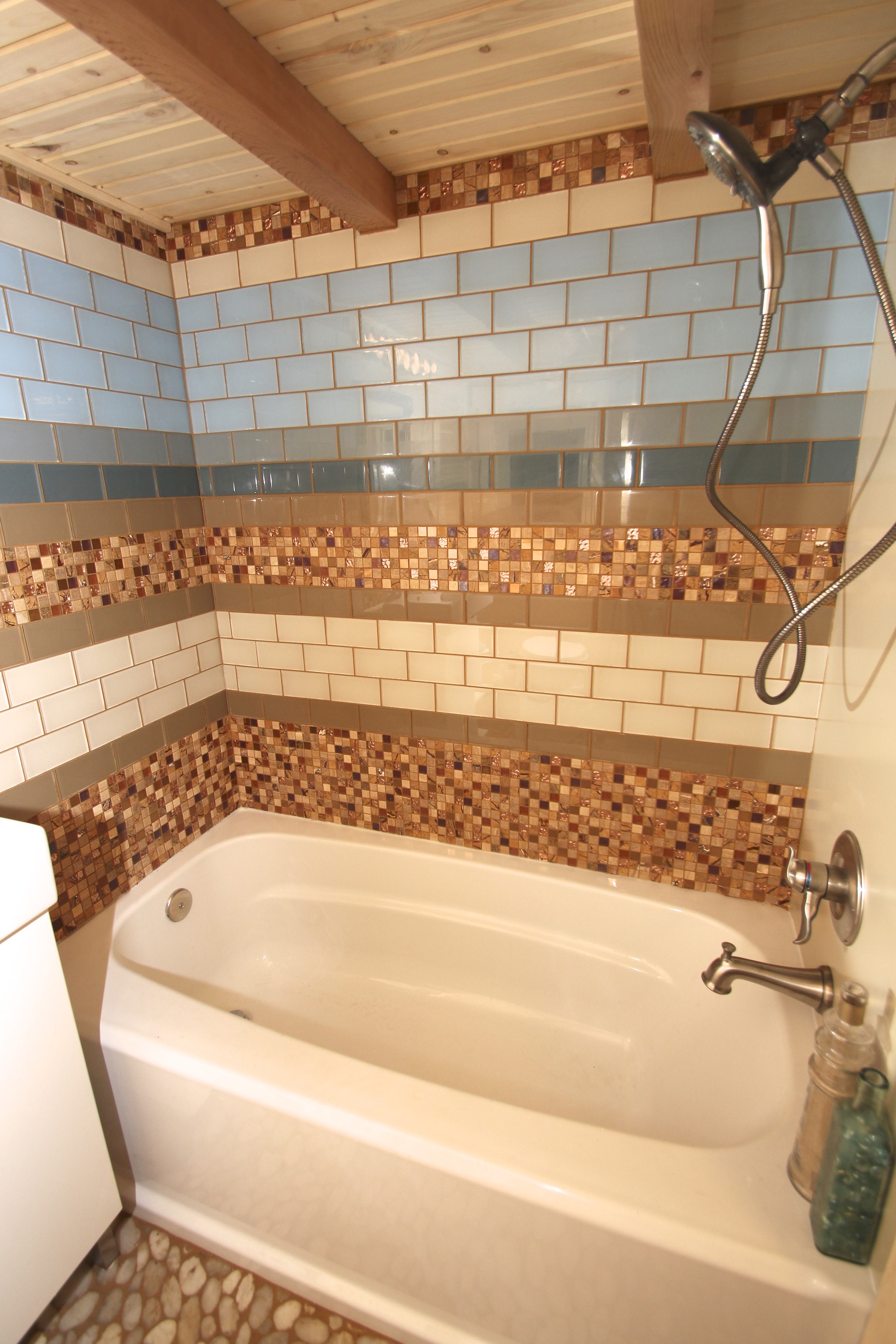 Last but not least the bathroom features a full bathtub, so one can enjoy relaxing time after a heavy workday. The blue and tan tile will make you feel like you are at a beach. Also comes with a dry toilet and the latest vanity for storage and handwash etc.