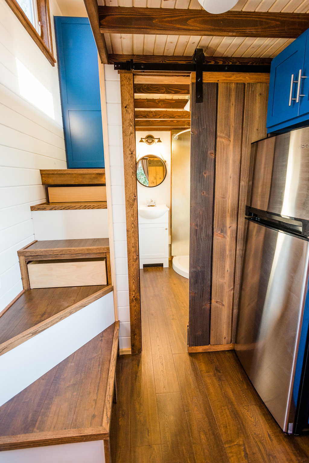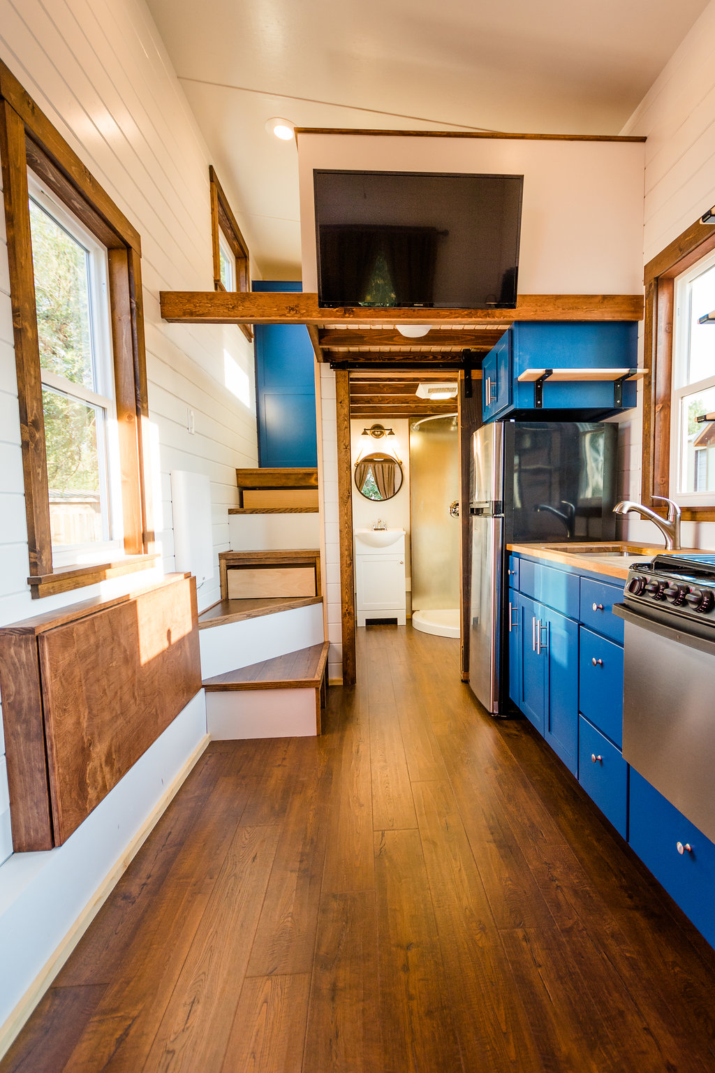 Julia’s by MitchCraft is a beautiful tiny house on wheels. The exterior of this house is very calming as it is colored in blue and white. A pop color has been added via the front door that is colored in an orangish-red shade. The interior of the house features a blue, white & light brown wood theme. White frame glass windows are there for fresh air & natural lighting. There is plenty of storage options present in this tiny house to store all of your essentials.