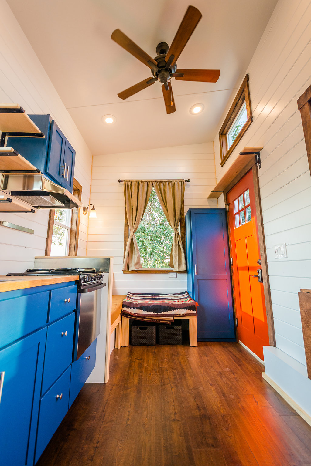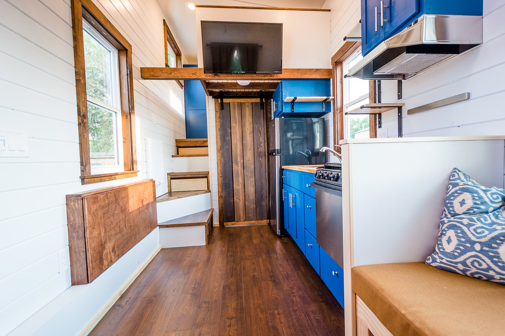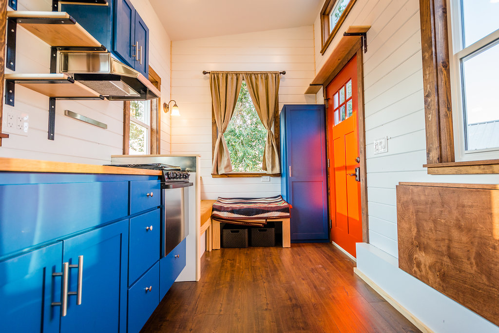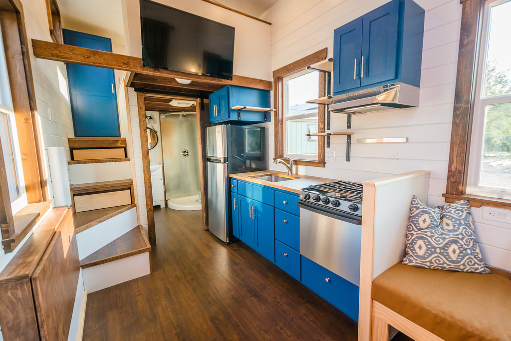 As soon you enter this tiny house manufactured by MitchCraft through the orangish-red color door, the first thing you notice is your living space. An L-shaped sitting bench is there that can accommodate 3 people comfortably. You can store your excess stuff under the bench. On the door right you see a beautiful blue-colored cabinet where you can store your outdoor shoes & coats and jackets. There are two windows in the living room that allows natural lighting to come through. One can read a novel by sitting in the living area and enjoy the external views.