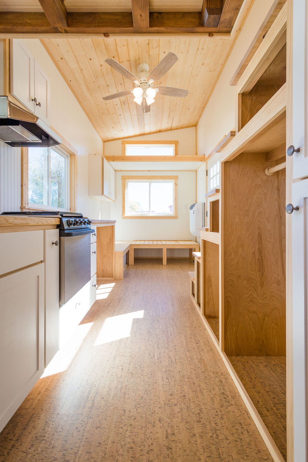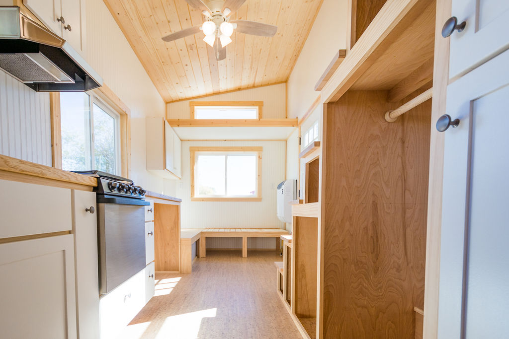 As soon as you move to the left you enter your beautiful compact kitchen. The kitchen features a straight countertop, gas burner, hood, sink, oven/microwave, and storage space. Shelves are there on the upper sector of the kitchen and one cupboard over the hood is also present for storing your spices and other grocery stuff. Next to the sink, you see your washer/dryer for doing your laundry. The stairs have open boxes in them for storing showcase items or your personal stuff. A few cabinets are also there opposite the burner. LED lights are there throughout the entire house.