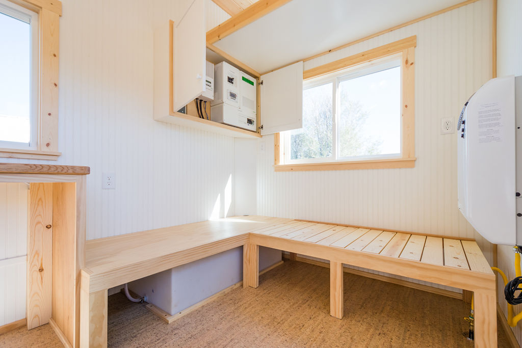 The white door lets you enter the living room that features an L-shaped sitting bench, a tiny cupboard, and storage left above the living area. One can put cushions and comfortable seats over the bench for more comfort and can store their shoes underneath it. Easily 4-5 people can sit and talk on the L-shaped bench. There is a window behind the bench for ventilation and natural lighting. The following appear to be fine.