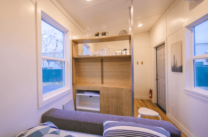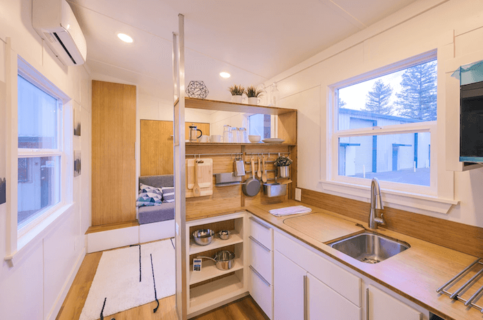The interior boasts industrial strength vinyl plank flooring and bamboo countertops. The living room converts to a bedroom with a fold-down murphy bed. The kitchen features a sink with cutting board cover and a microwave.