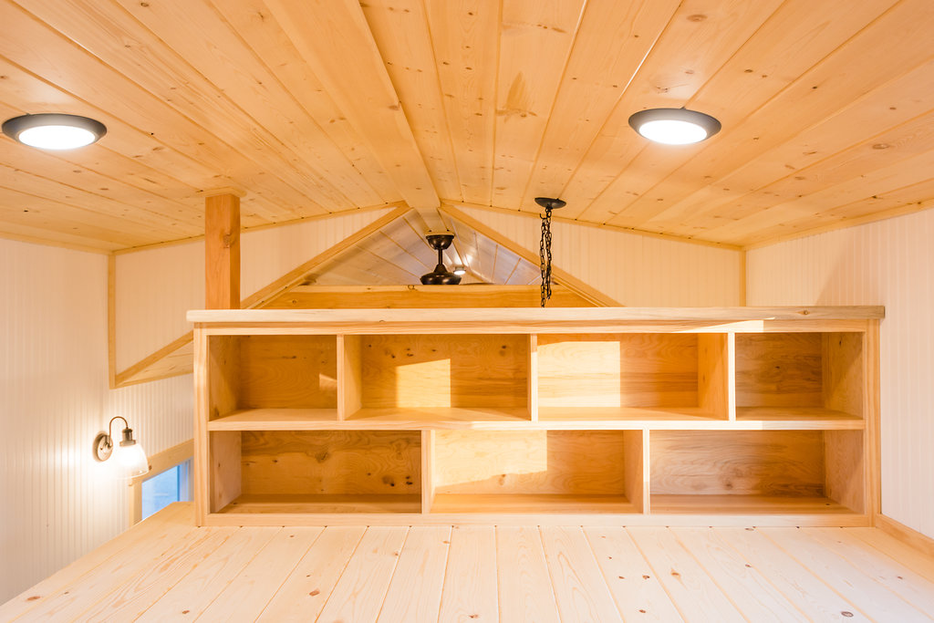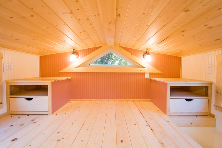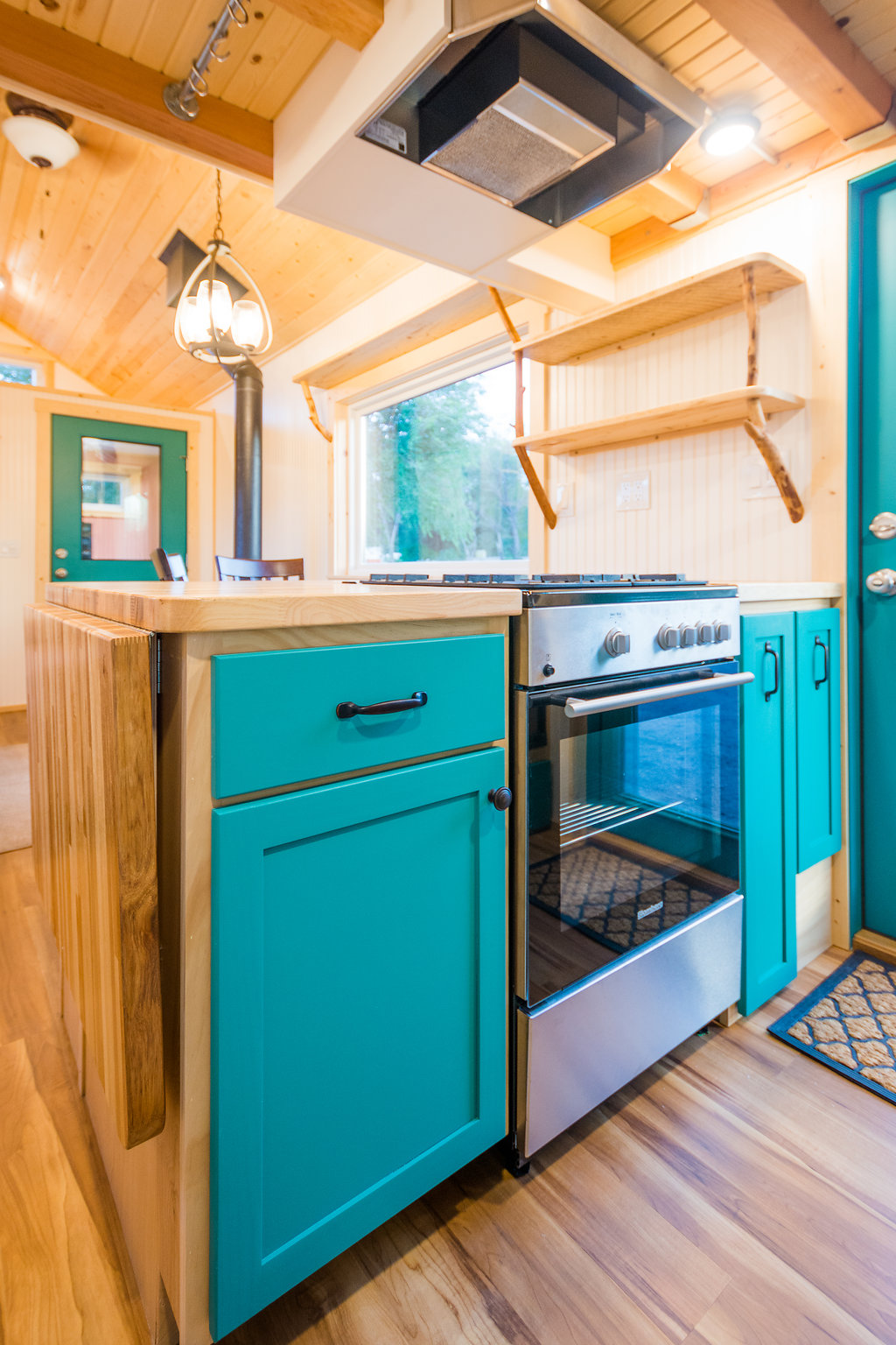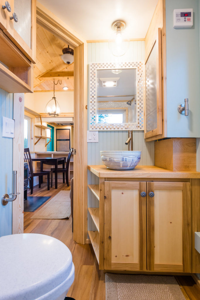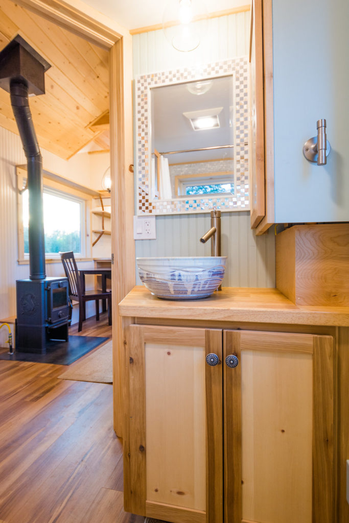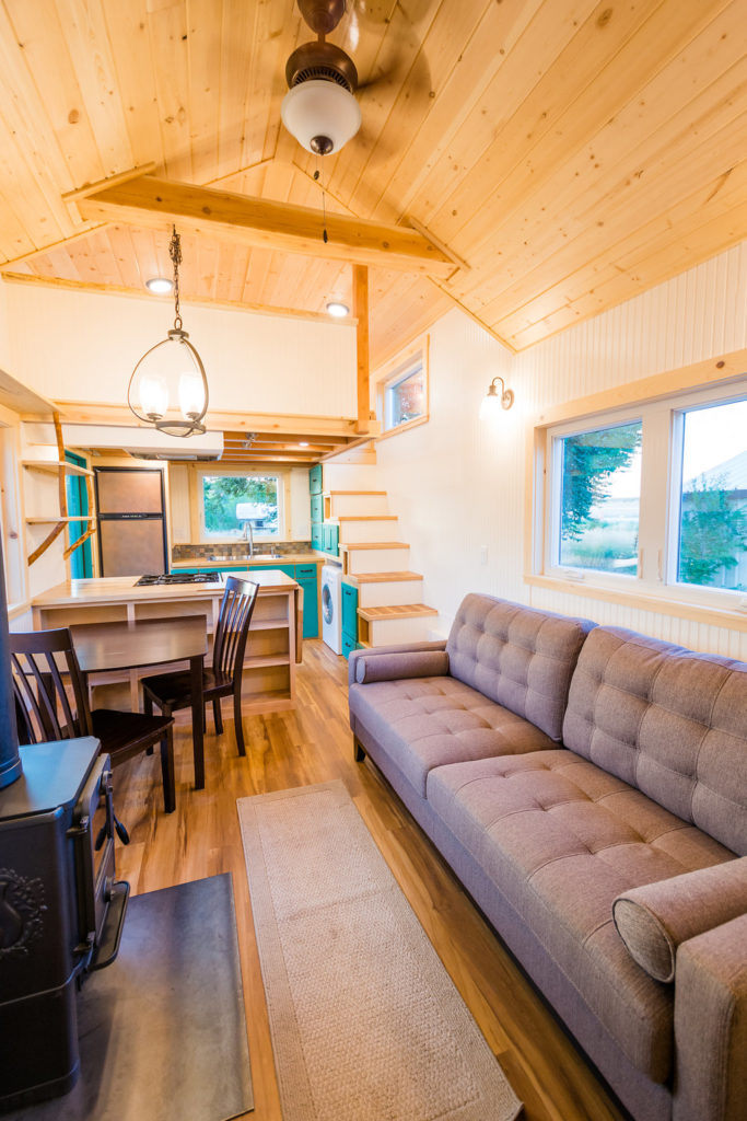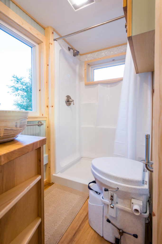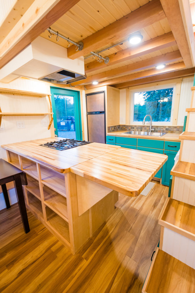 The kitchen is pretty chic and beautiful. It features a gas stove, fridge, washer/dryer combo, double sink with tap, hood, countertop, and storage space colored in green. One can cooking while enjoying the outside view via big glass windows. There is plenty of storage option in the kitchen itself that you don’t have to worry about in the entire house. The color combination in the kitchen matches the entire tiny house and looks elegant.