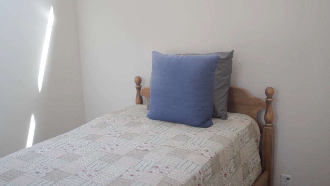 There is sufficient leeway left and you can conveniently adjust a work desk with a single chair too. The open kitchen is equipped with all the necessary appliances and more. The single kitchen counter has a smooth black granite top, a dual stainless steel sink, a 4 burner gas stove and oven combination and a neat arrangement of drawers and cabinets underneath, for extra storage.